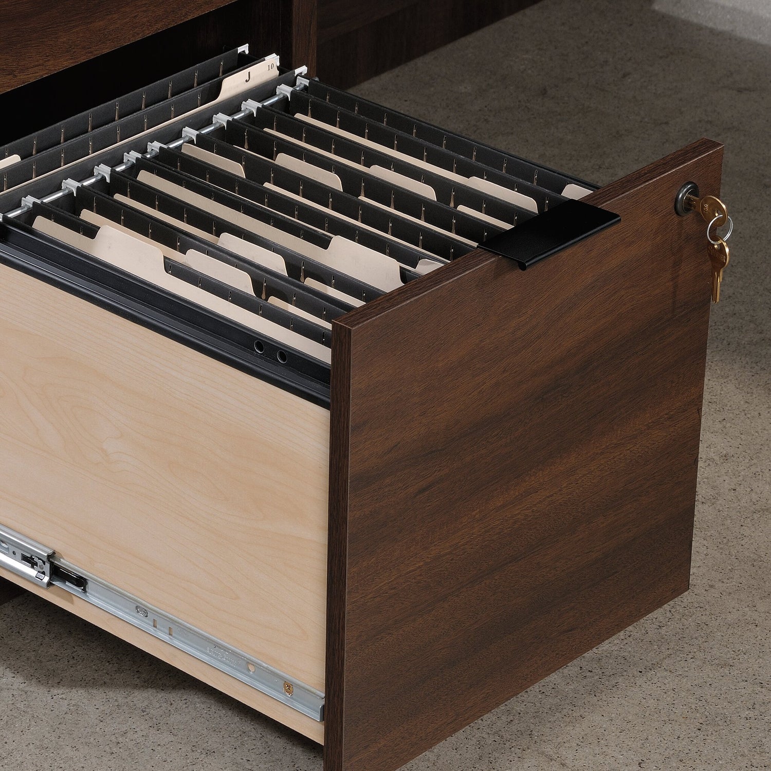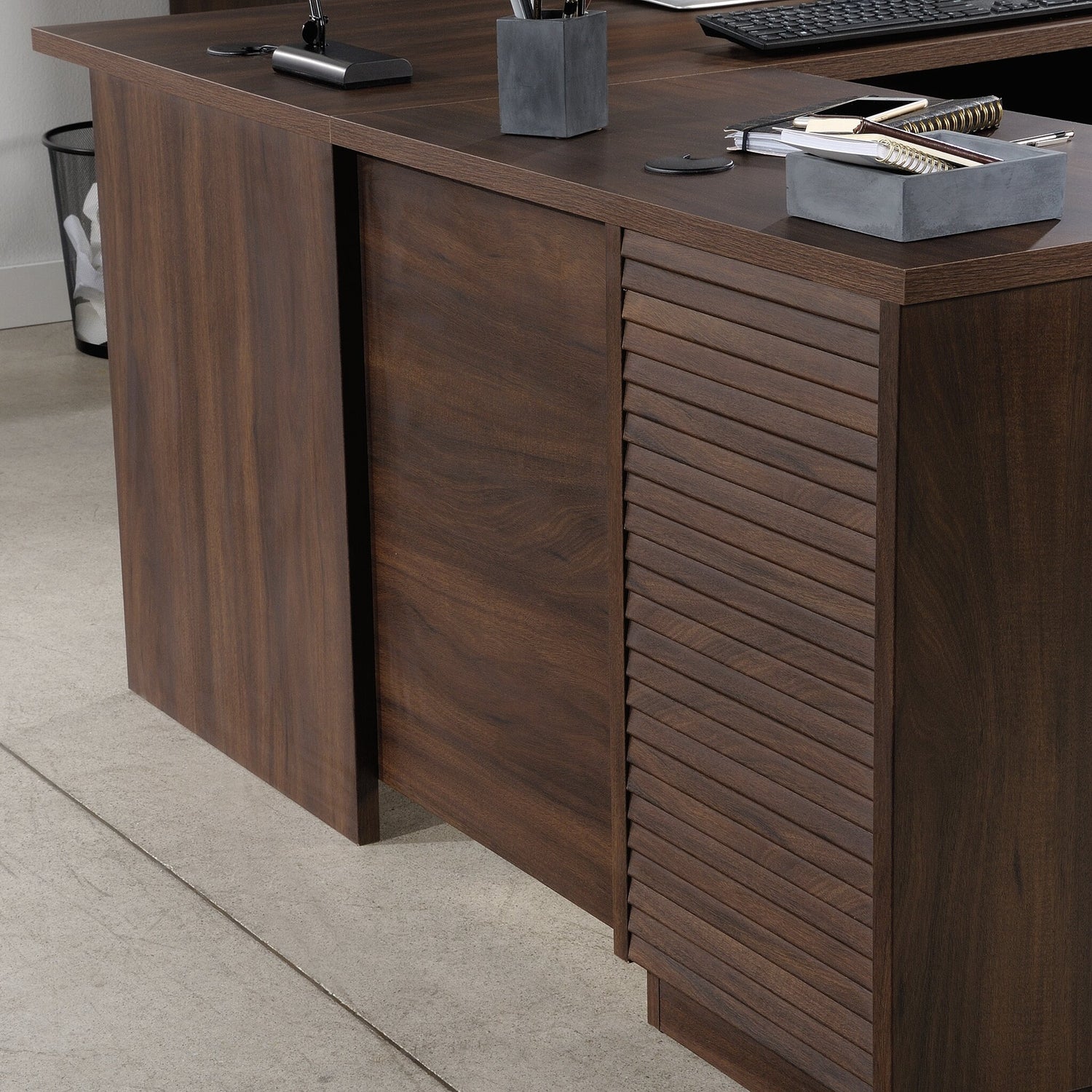 For a commercial office look that is unique with elevated construction, this Palo Alto L-shaped desk is for you. A durable heat-, stain- and scratch-resistant top surface with impact-resistant, high-grade thermoplastic edges make this workspace perfect for placing home decor or your printer and laptop. Featuring three drawers, including a file drawer, your office essentials and letter-size files will be organized and easy to reach. Plus, an adjustable shelf inside the cabinet adds even more versatile storage options. With a dark brown finish, this desk is a grand addition to your office space.