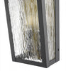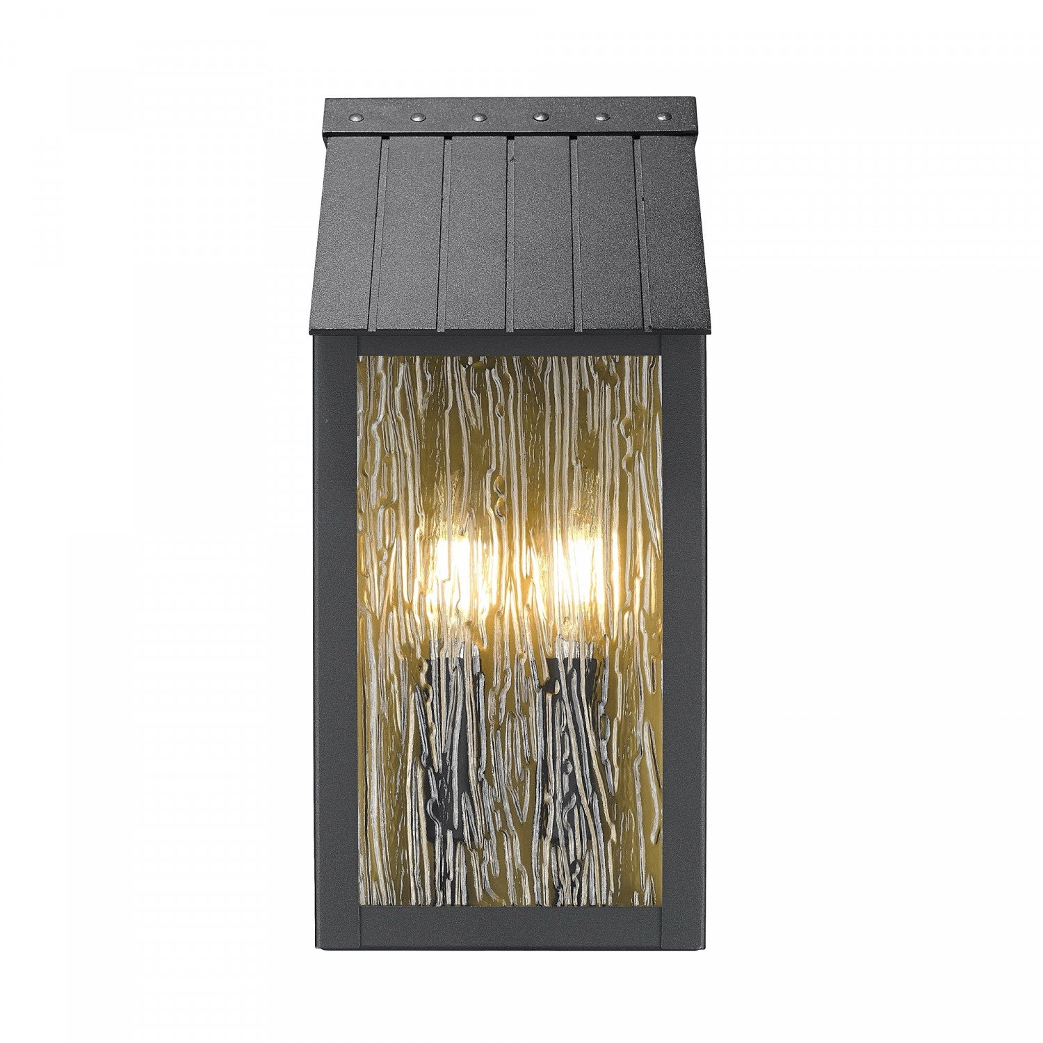 The point collection outdoor wall sconce exudes both contemporary flair and classic allure. Its bold black frame contrasts beautifully with the warm glow of the interior brass backplate, while the rain-textured glass mimics cascading droplets, casting a soft, inviting light. Perfect for any outdoor setting, it offers both style and warmth.