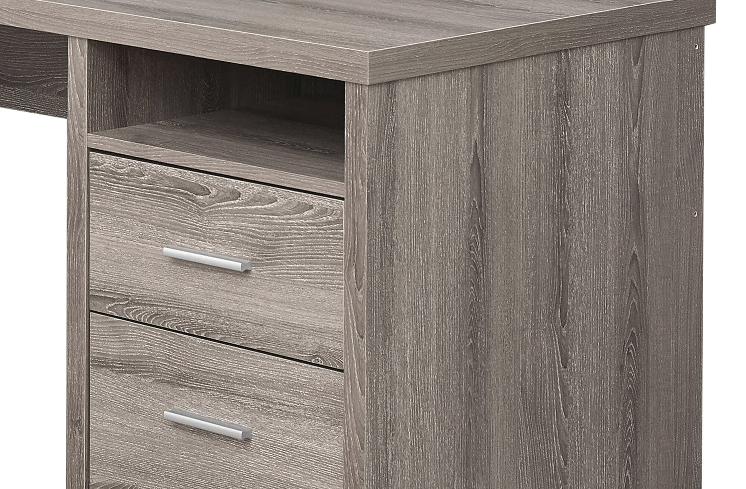 The "L" stands for more than just shape: It stands for "lots" of convenience and room to work. This Pollie desk has a reversible configuration so you can set up the side with the storage unit on the left or right according to your preference. The cubby and two storage drawers (including one for letter or legal-sized hanging files) help to keep the desktop clutter-free. Providing support for the spacious desktop are two robust, rectangular metal legs in a contrasting silver finish. This L-shaped computer desk saves space when used in a corner but is finished on all sides for a polished look wherever it is placed in an office.
