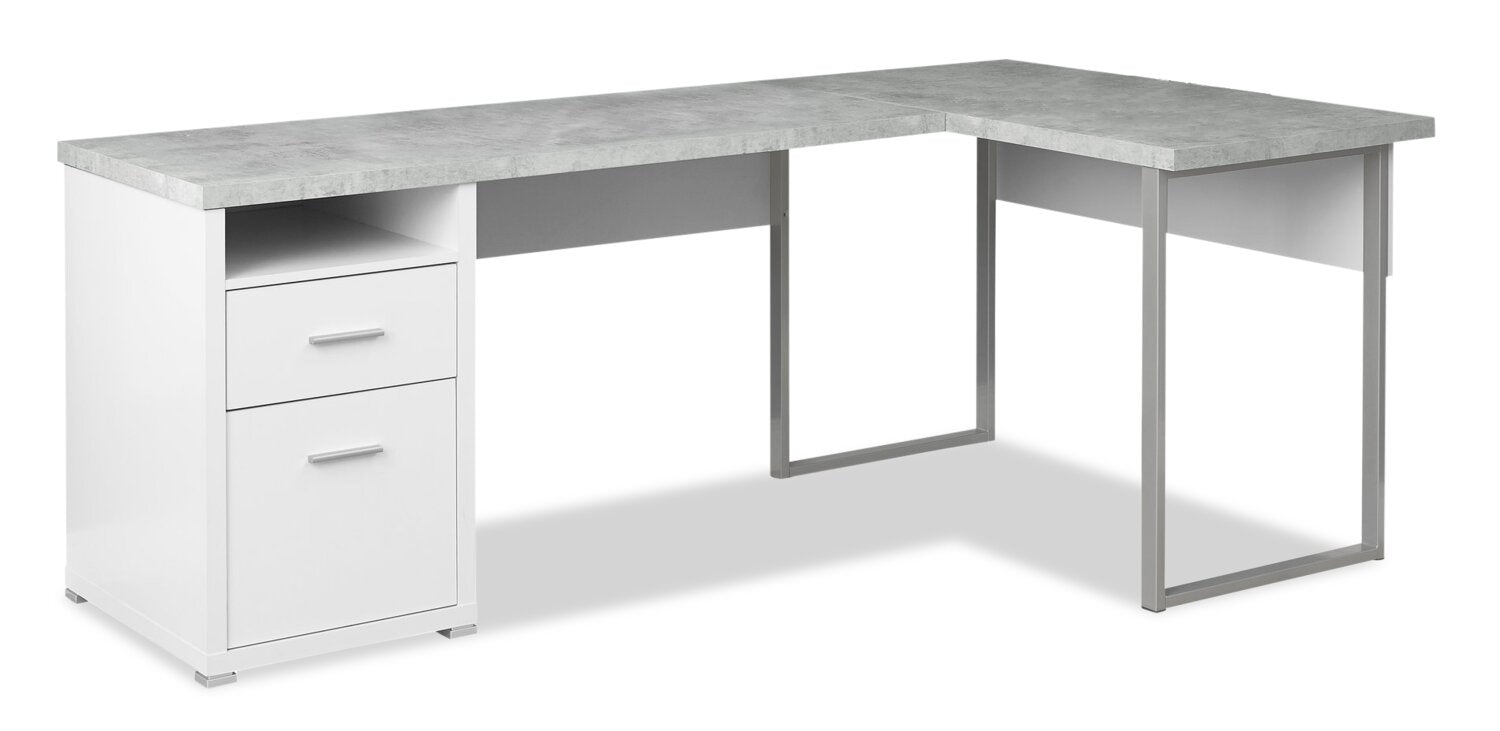 The "L" stands for more than just shape: It stands for "lots" of convenience and room to work. This Pollie desk has a reversible configuration so you can set up the side with the storage unit on the left or right according to your preference. The cubby and two storage drawers (including one for letter or legal-sized hanging files) help to keep the desktop clutter-free. Providing support for the spacious desktop are two robust, rectangular metal legs in a contrasting silver finish. This L-shaped computer desk saves space when used in a corner but is finished on all sides for a polished look wherever it is placed in an office.