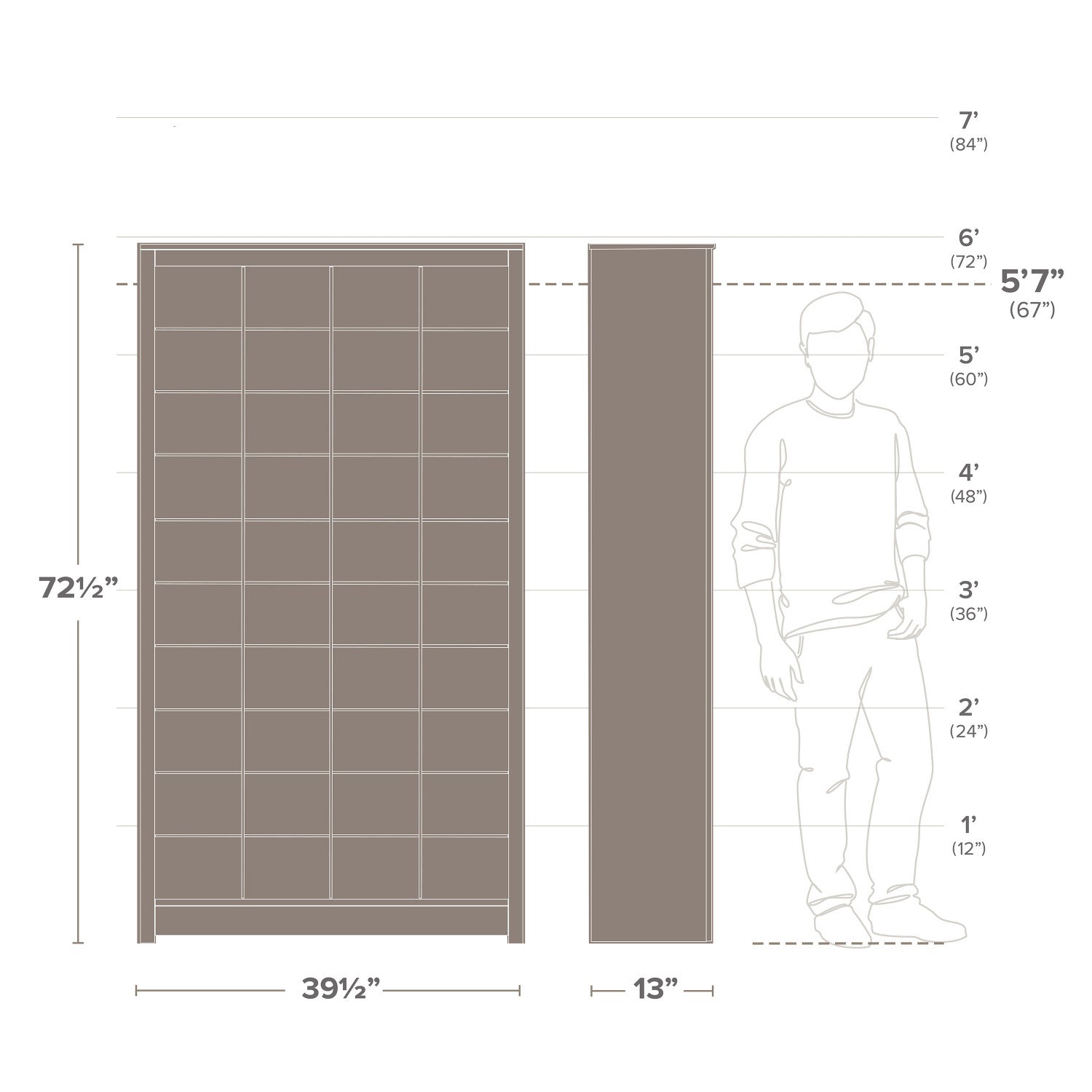 Width: 39.5" (100.3 cm) Height: 72.5" (184.2 cm) Depth: 13" (33.0 cm)