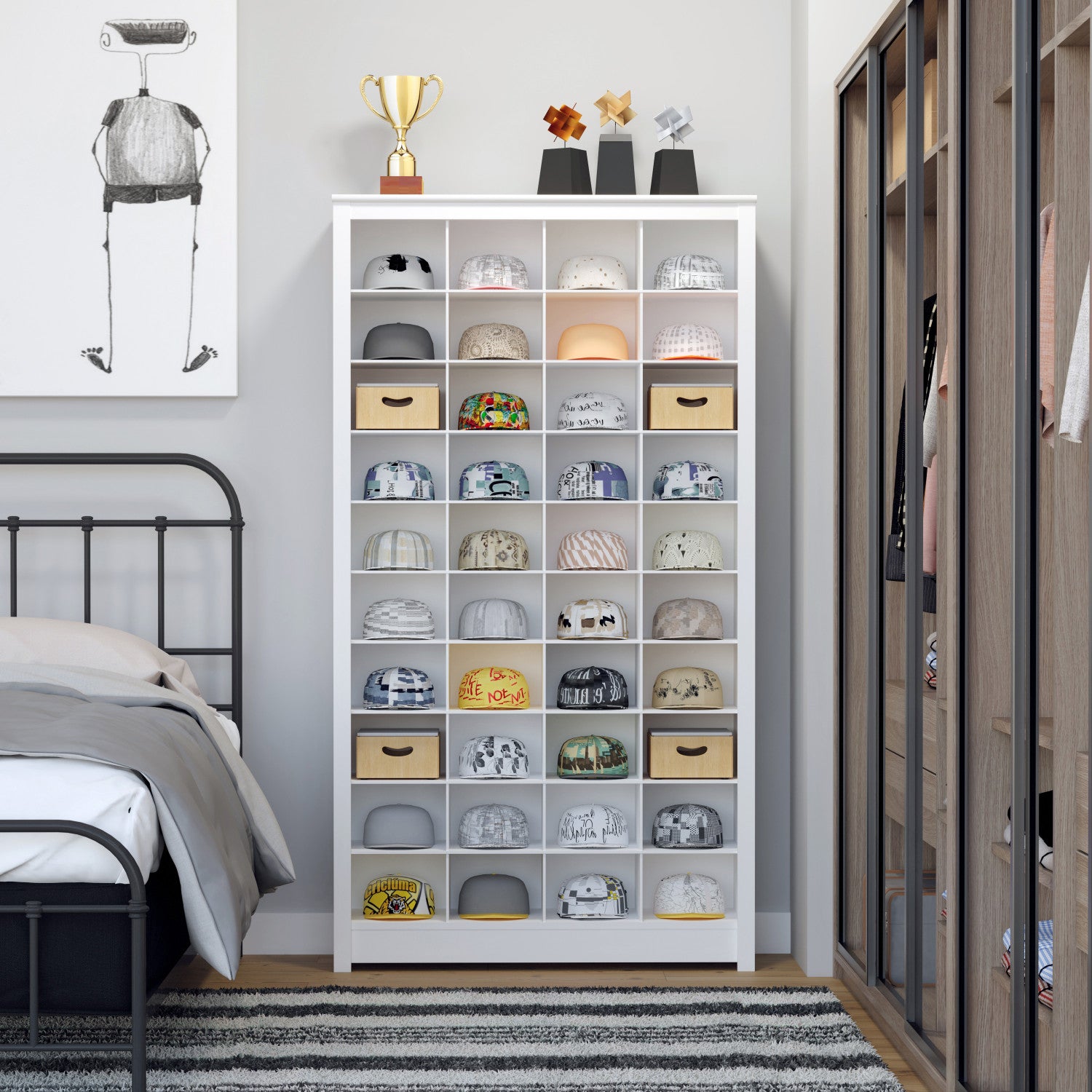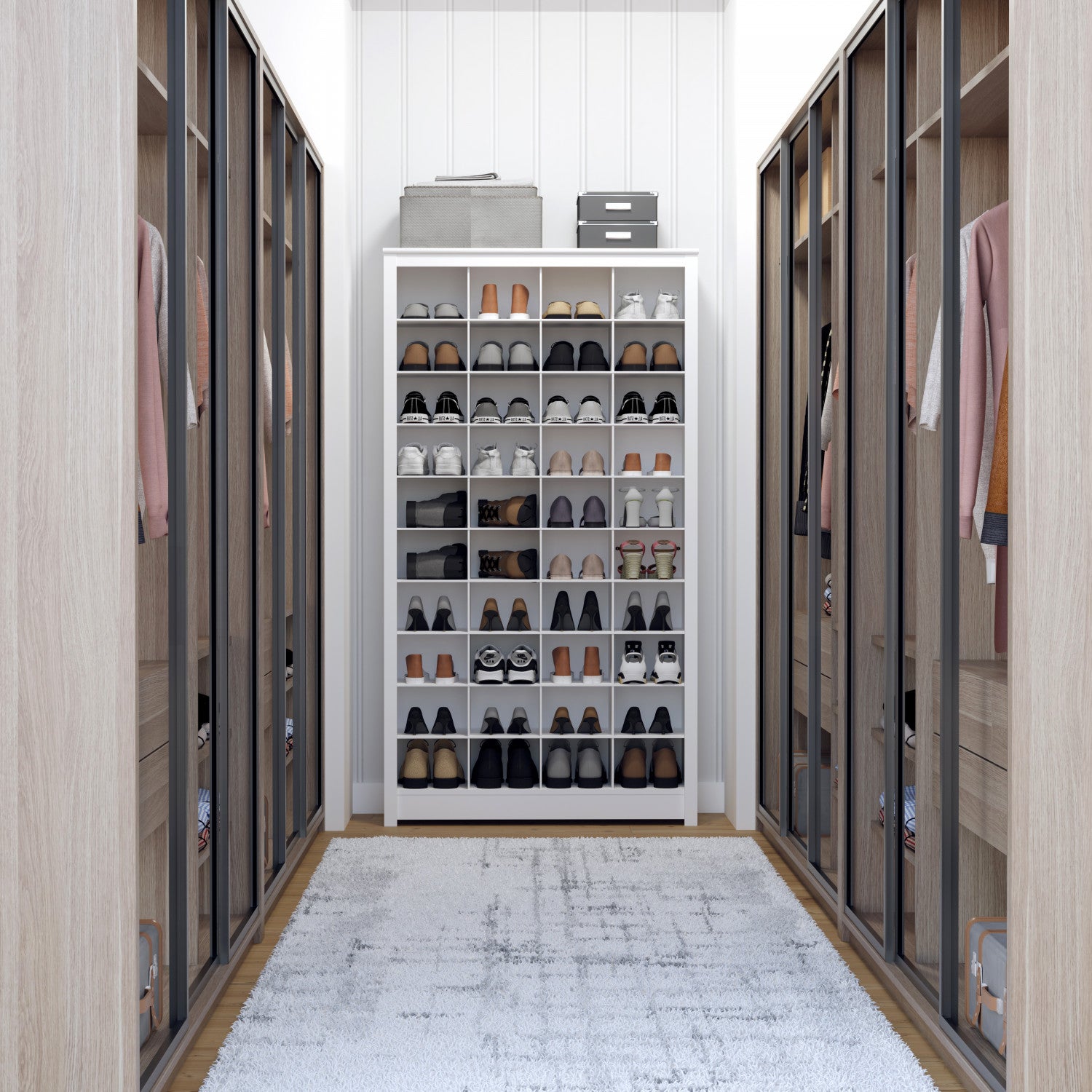 The Prepac White Tall Storage Cabinet (13"D x 39.5"W x 72.5"H) offers 40 shoe cubbies and adjustable shelves for versatile storage, fitting shoes up to size 13. Crafted from durable, non-toxic materials, it's perfect for entryways.