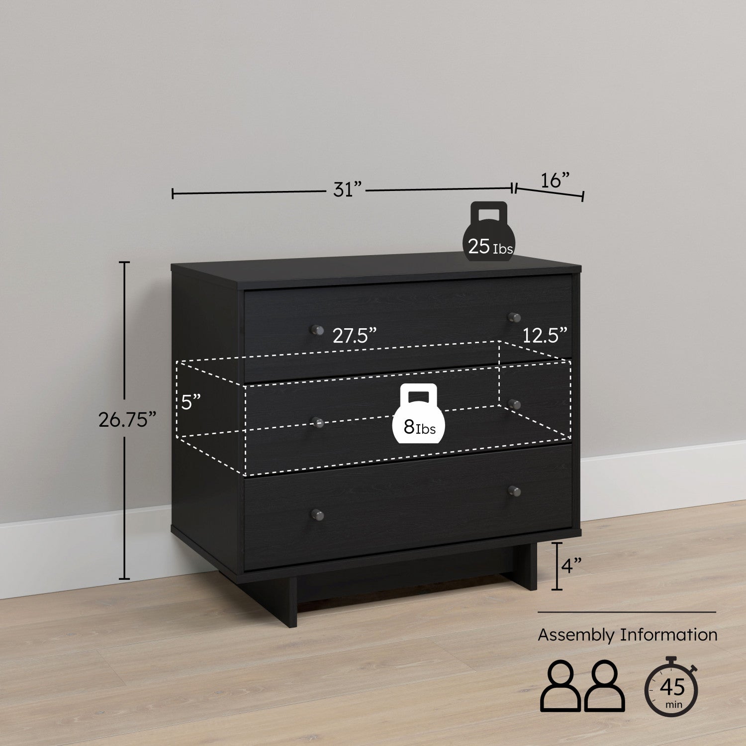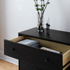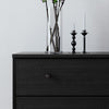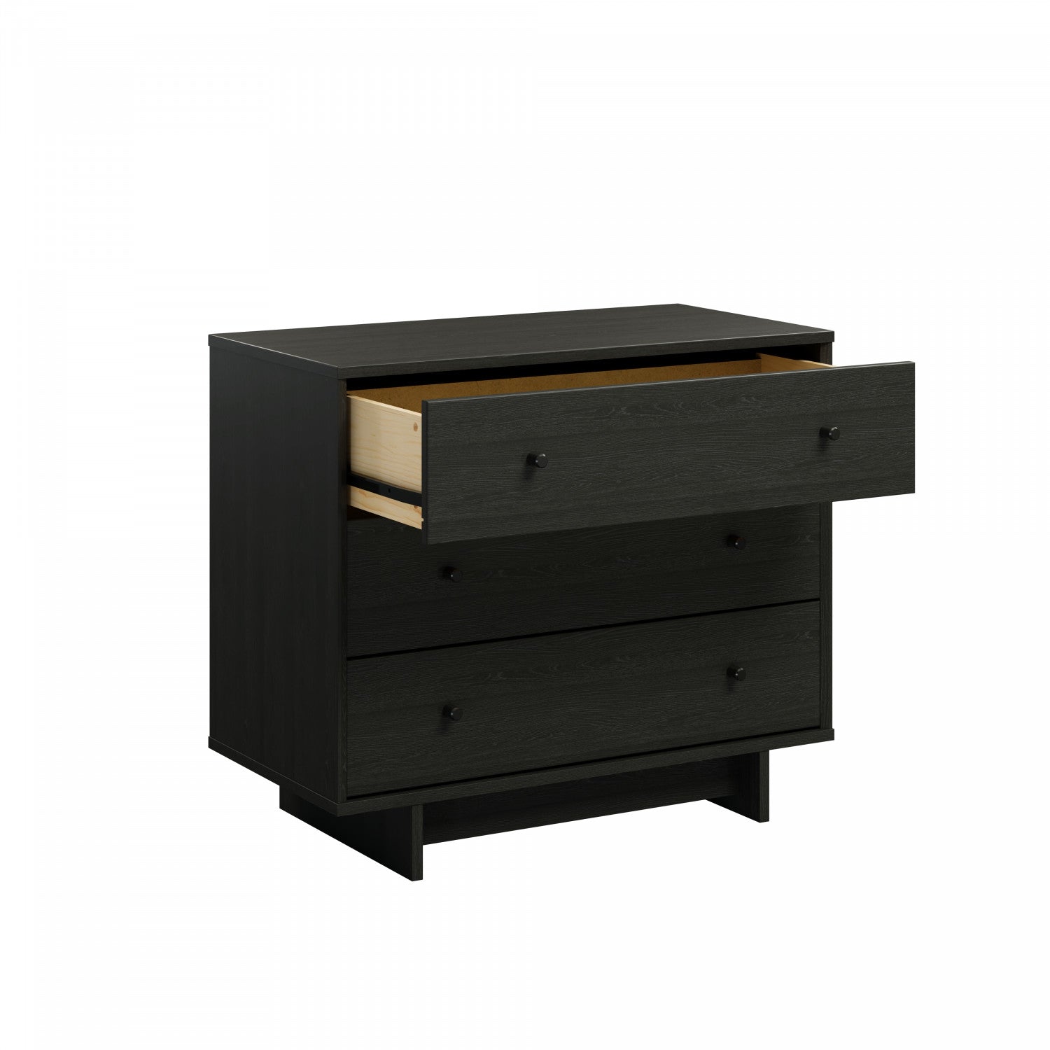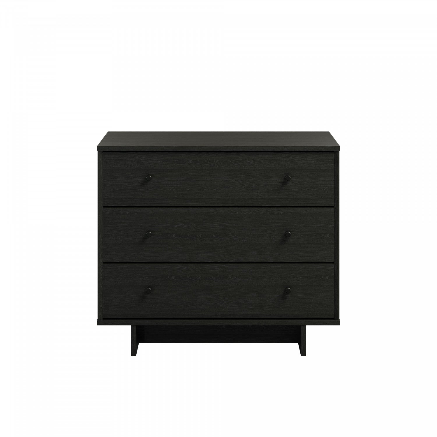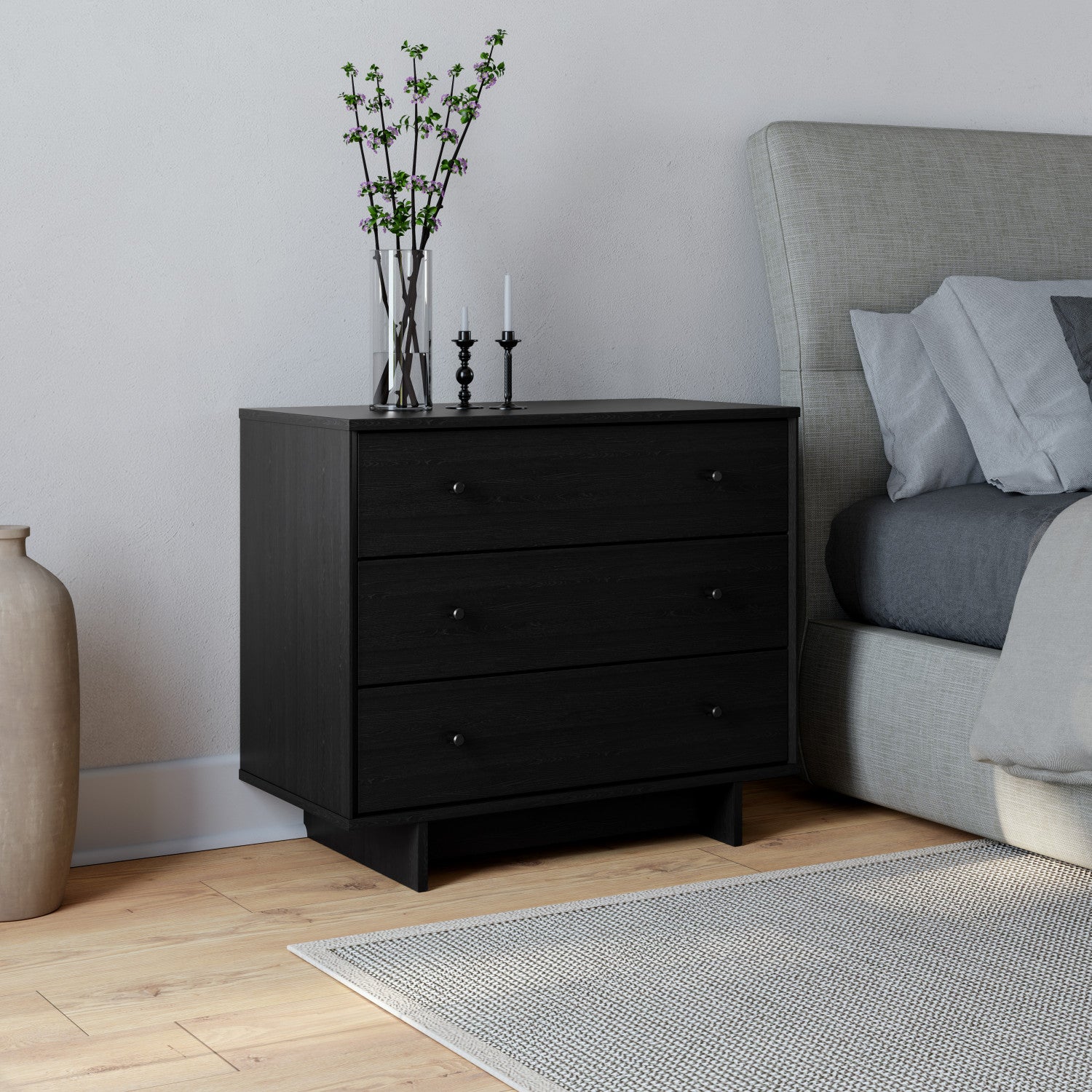 The Finnley nightstand features a stylish black oak finish and measures 16" D x 31" W x 26.75" H, offering three spacious drawers for organized storage. Its versatile design suits any room, making it a functional and elegant addition to your home.