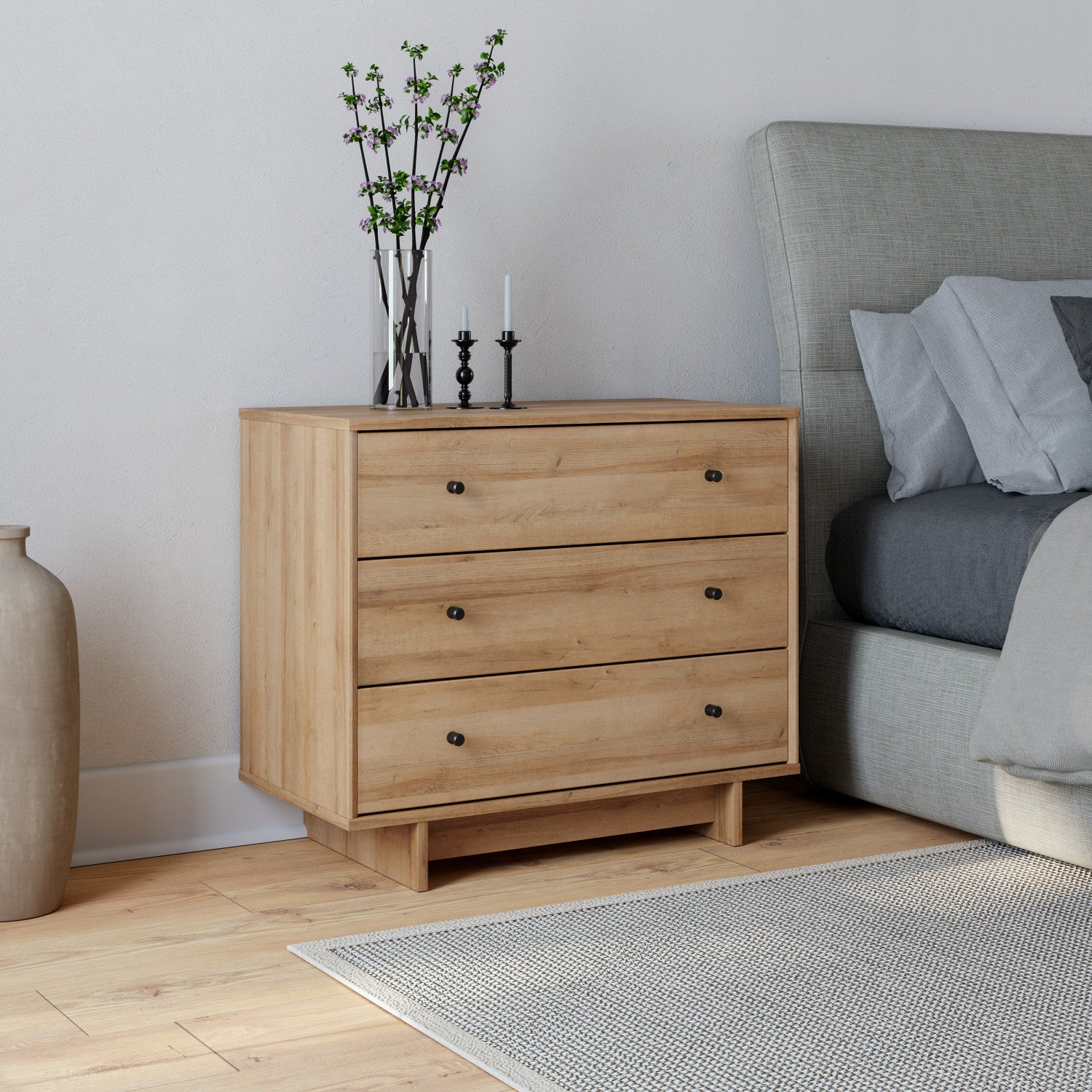 The Finnley Nightstand combines timeless elegance with modern functionality, featuring an extra-wide design (16" D x 31" W x 26.75" H) and three spacious drawers for ample storage. Its striking natural oak finish suits various styles, making it a versatile addition to bedrooms or living spaces.