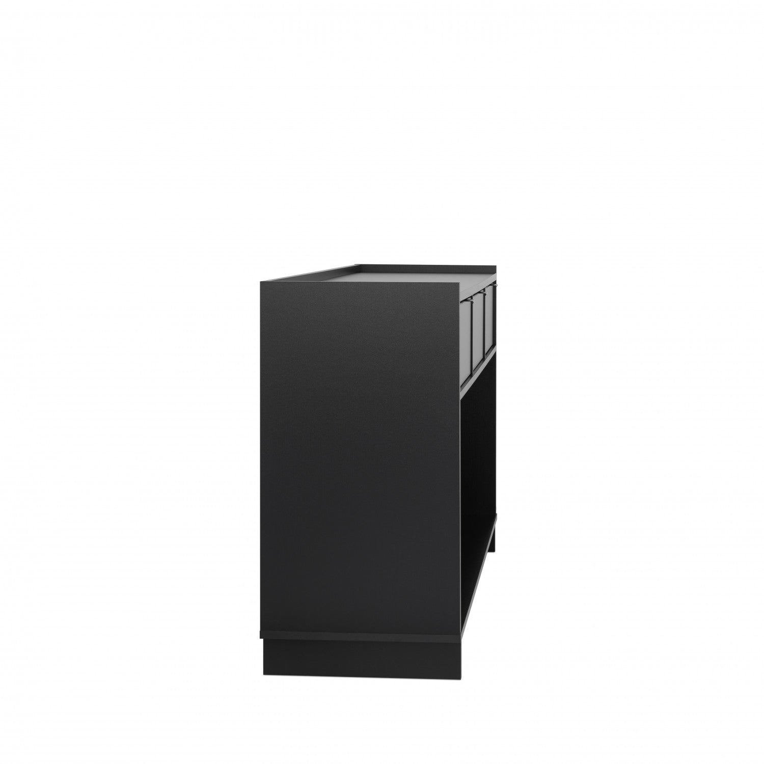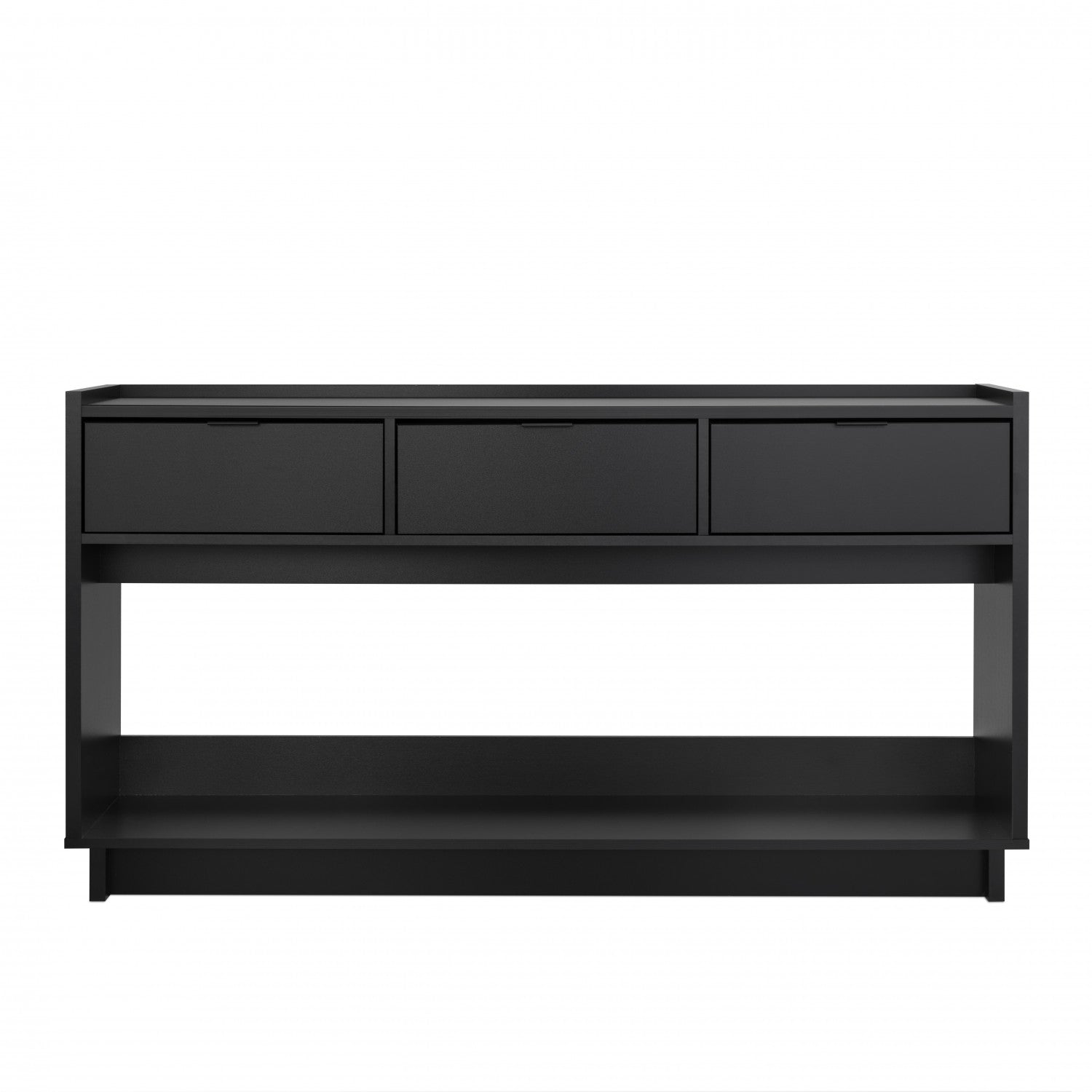 The Prepac Black Console Table features three drawers and under-console storage, measuring 15.75"D x 60.25"W x 32"H, perfect for entryways or living rooms. Its sleek black finish offers versatile storage and easy assembly.