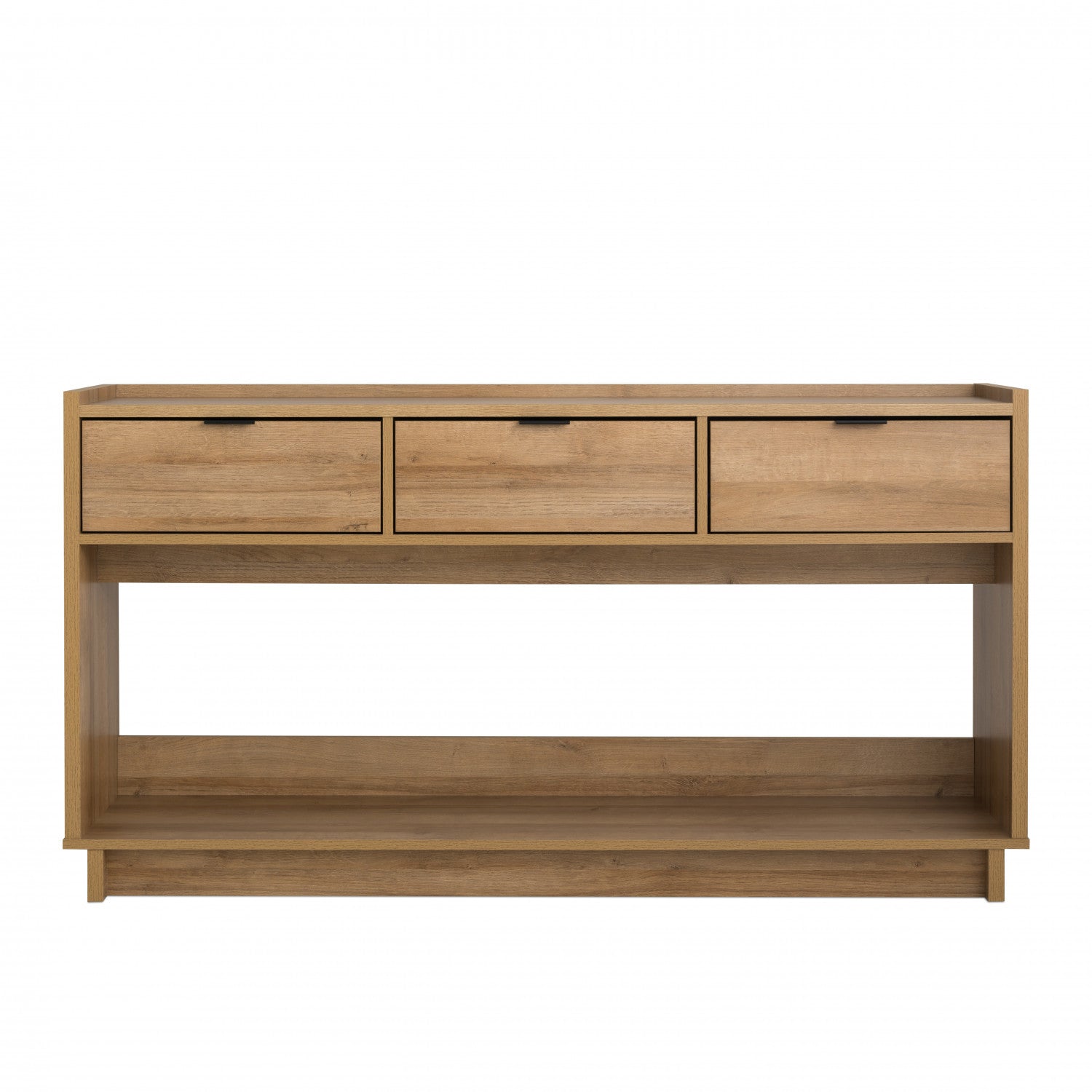 The Prepac Natural Oak Console Table features three drawers and under-console storage, measuring 15.75"D x 60.25"W x 32"H, making it ideal for organizing essentials in any room. Its modern design and natural oak finish enhance various decors, serving as a versatile media console or entryway table.