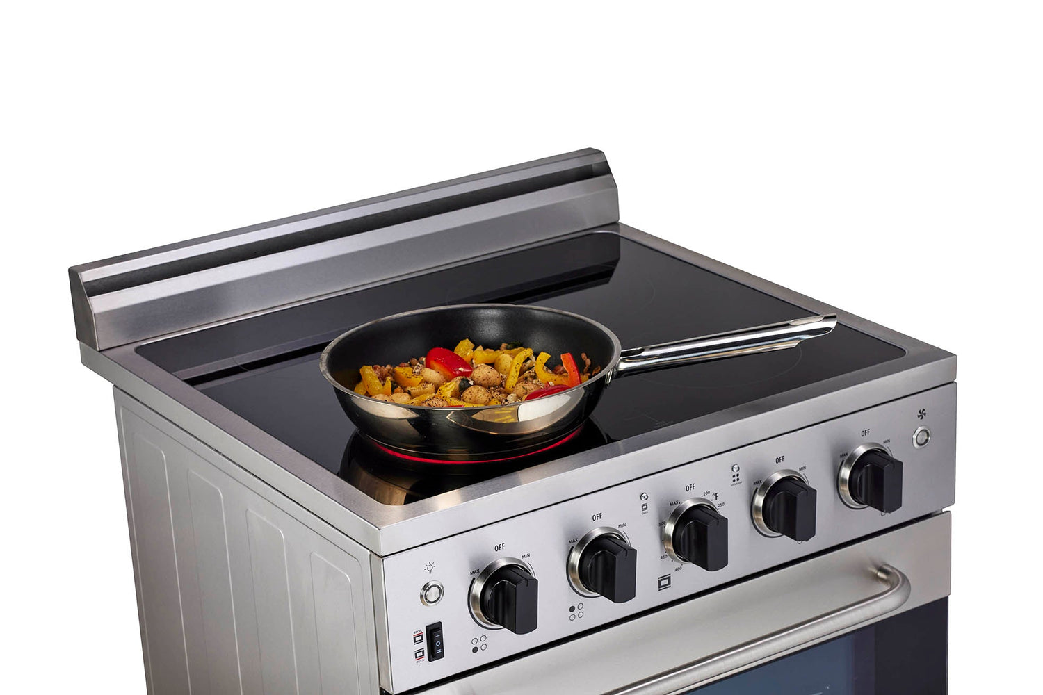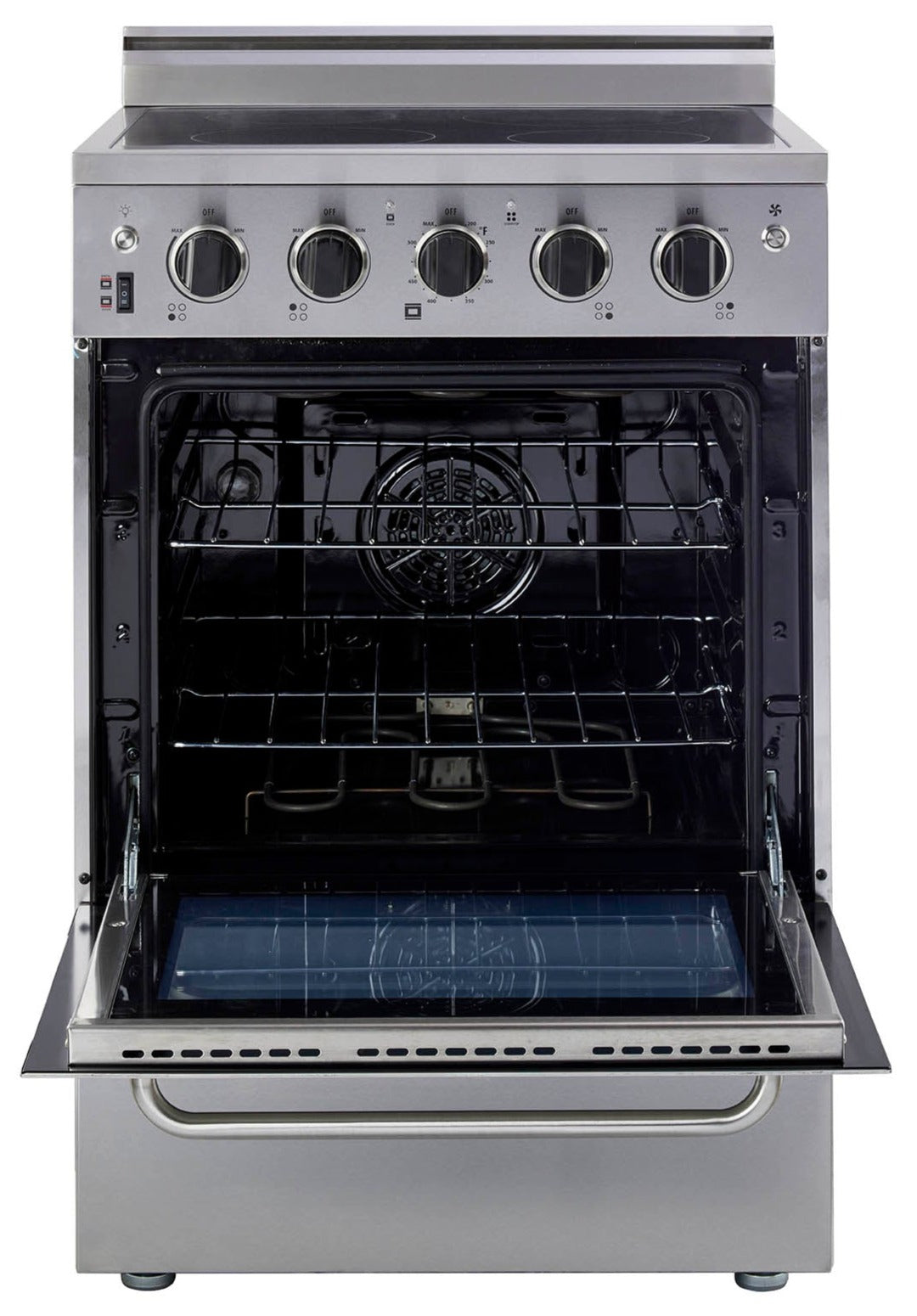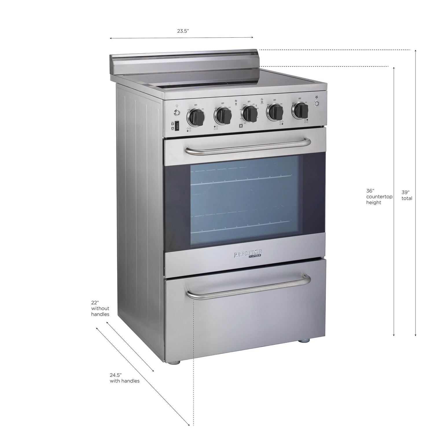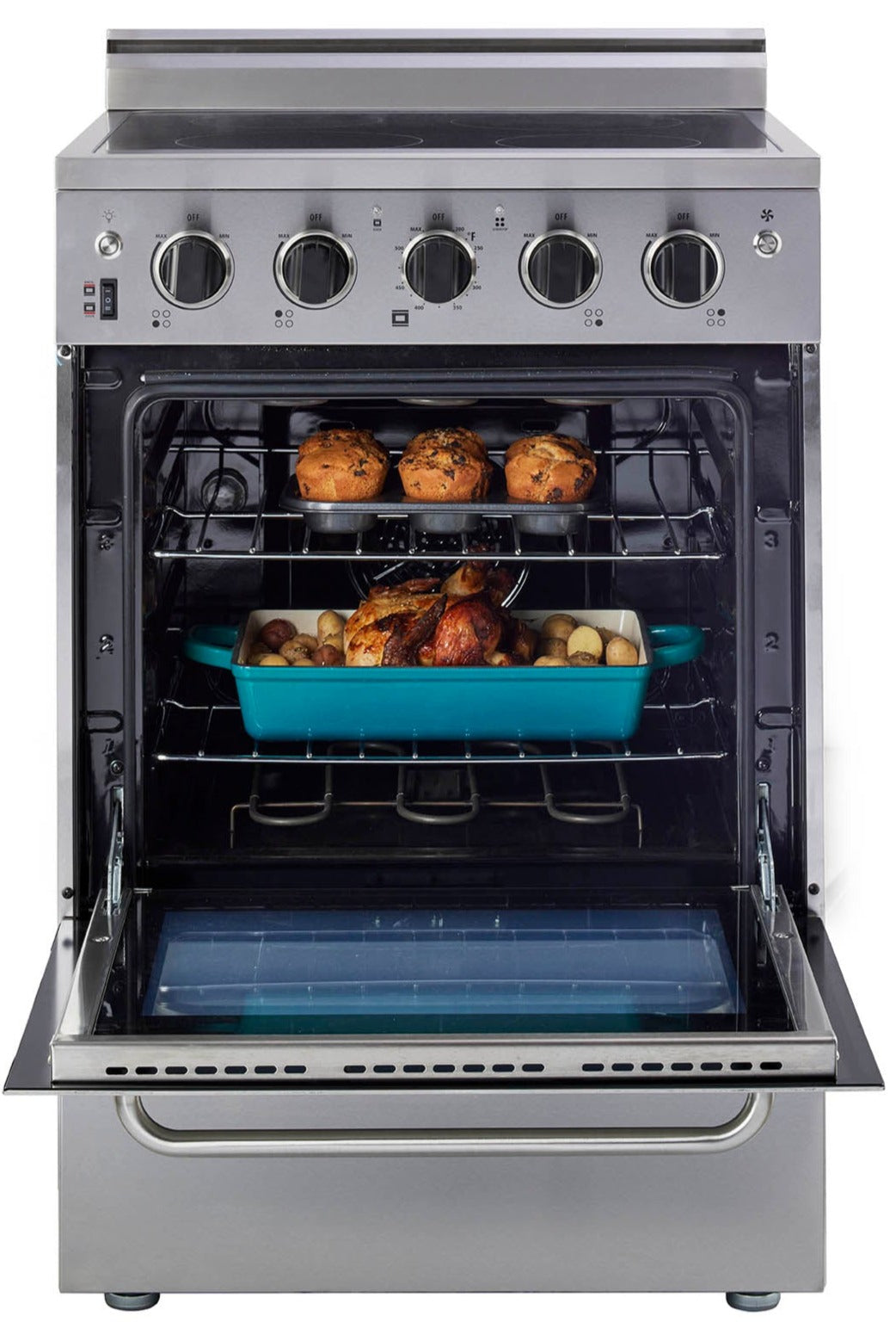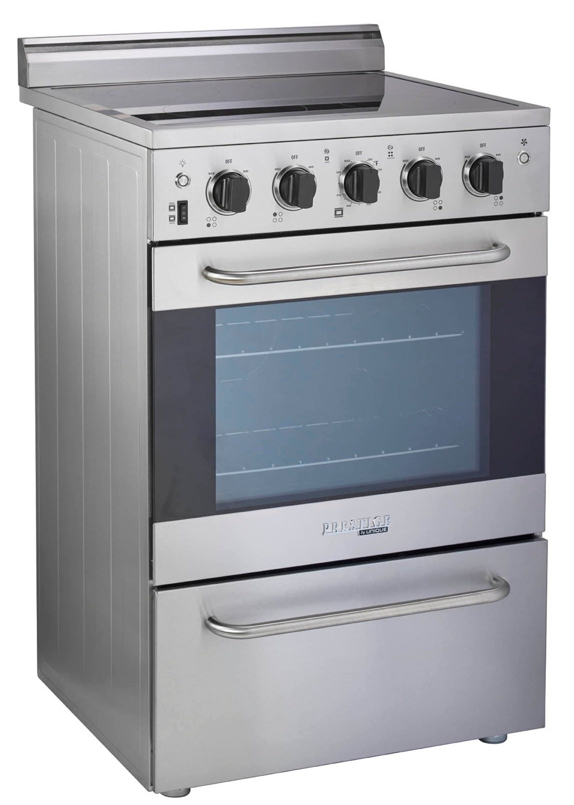 The Prestige 24” Electric Convection Range comes with a sleek glass 4 element electric cooktop capable of an intense sear or delicate sauce simmering. A smart hot burner indicator shows which burners are still hot while the glass cooktop makes for easier cleanup. Compact kitchen spaces deserve all the style, convenience, and impact found in bigger spaces, from convection cooking for perfectly even heat, to a waist-high broiler for intense searing this compact range also offers a compartment for extra storage. Cooking and cleaning are completely effortless.