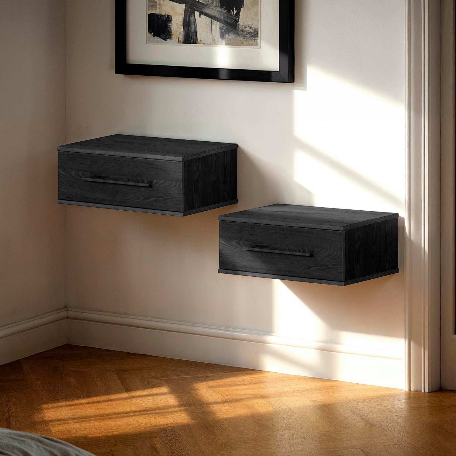 Set of 2 nightstands for the bedroom. Opt for an all-in-one storage solution in your bedroom with this set of 2 wall-mounted bedside tables. Each features a spacious drawer, perfect for all your bedtime essentials. The drawer supports a maximum weight of 25 lb and features an elegant straight metal handle. This sophisticated touch makes for a contemporary decor that's both simple and modern. Wall-mounted floating bedside tables. Each floating bedside table comes with its own wall-mounting kit. Install them on either side of your bed at the height that best suits your needs. The advantage of this type of auxiliary storage is that it frees up floor space, for better circulation and easier cleaning! A wow effect guaranteed!