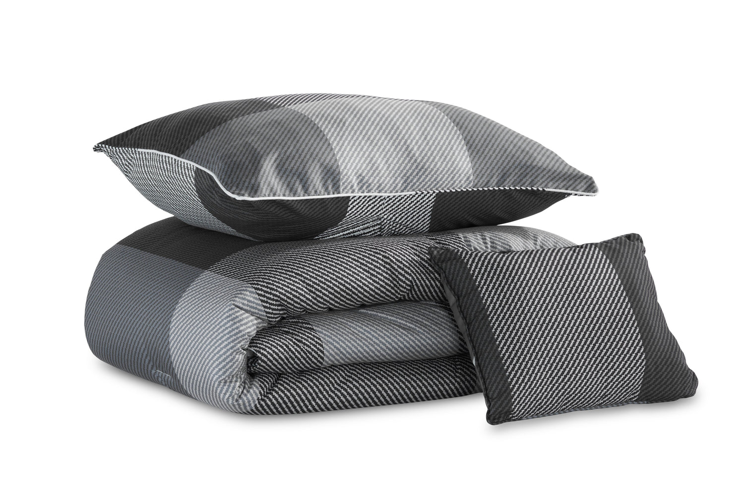 Dress your bed in classic style with this four-piece Charlie comforter set. Enjoy rustic comfort with modern flair as you cover yourself up in the grey and charcoal buffalo plaid print. It’s reversible with lighter tones on the other side and is made of microfibre for easy care – perfect for a busy lifestyle. Top your bedroom’s new look off with the included cushion, stitched with zigzag needlework.
