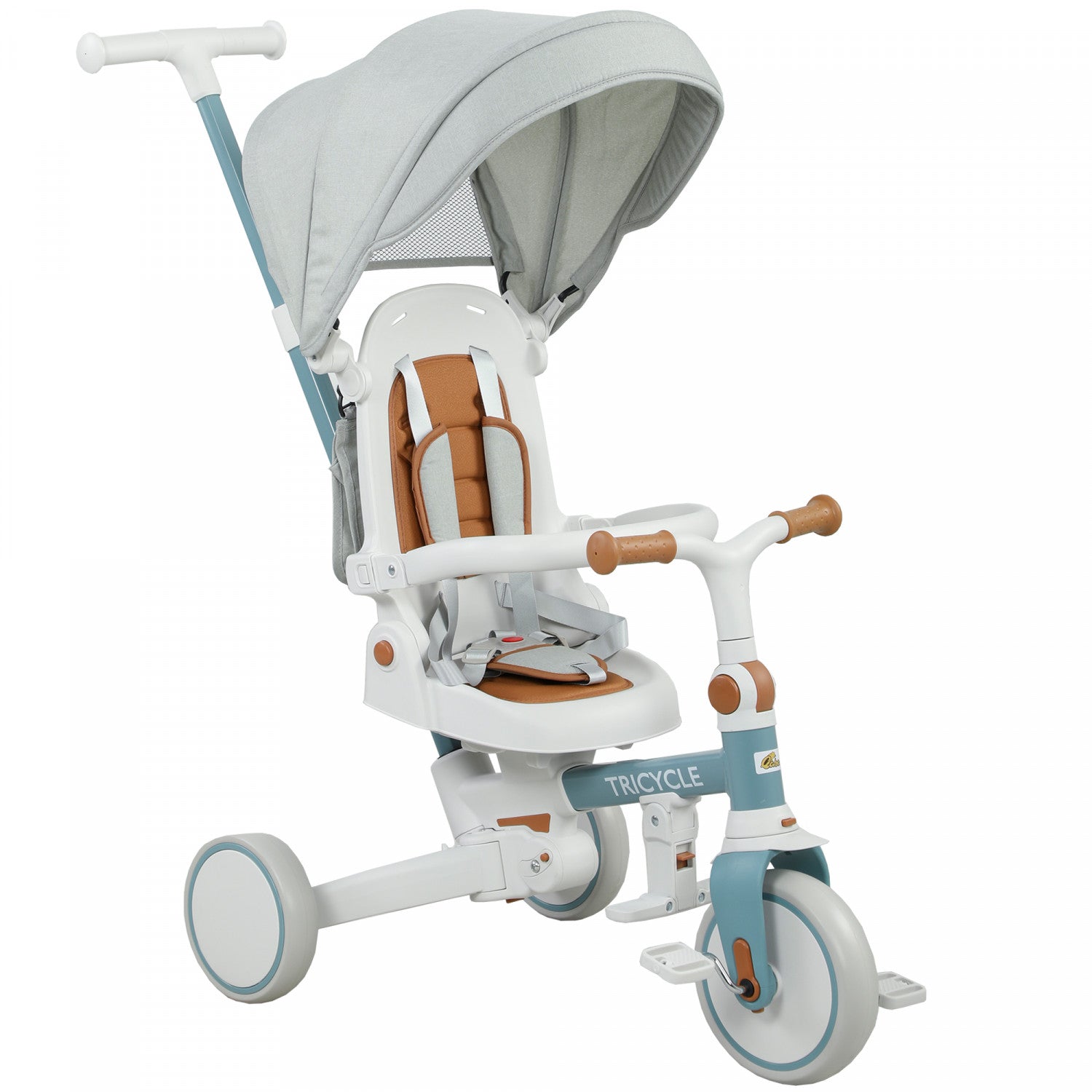 | Key Features | ● 7-in-1 design adapts as your child grows, saving money and space ● 5-point harness and removable guardrail keep your baby safe and secure ● Soft PU seat and adjustable backrest offer comfort for long rides ● The convertible seat promotes parent-child time ● Adjustable, detachable push handle fits parents of all heights, easy to remove ● Removable, 3-position canopy shields your child from the sun and UV rays ● Quick-fold tricycle fits easily in car trunks or small home spaces ● Equipped with a storage bag that holds wipes, bottles and toys for hands-free outings |