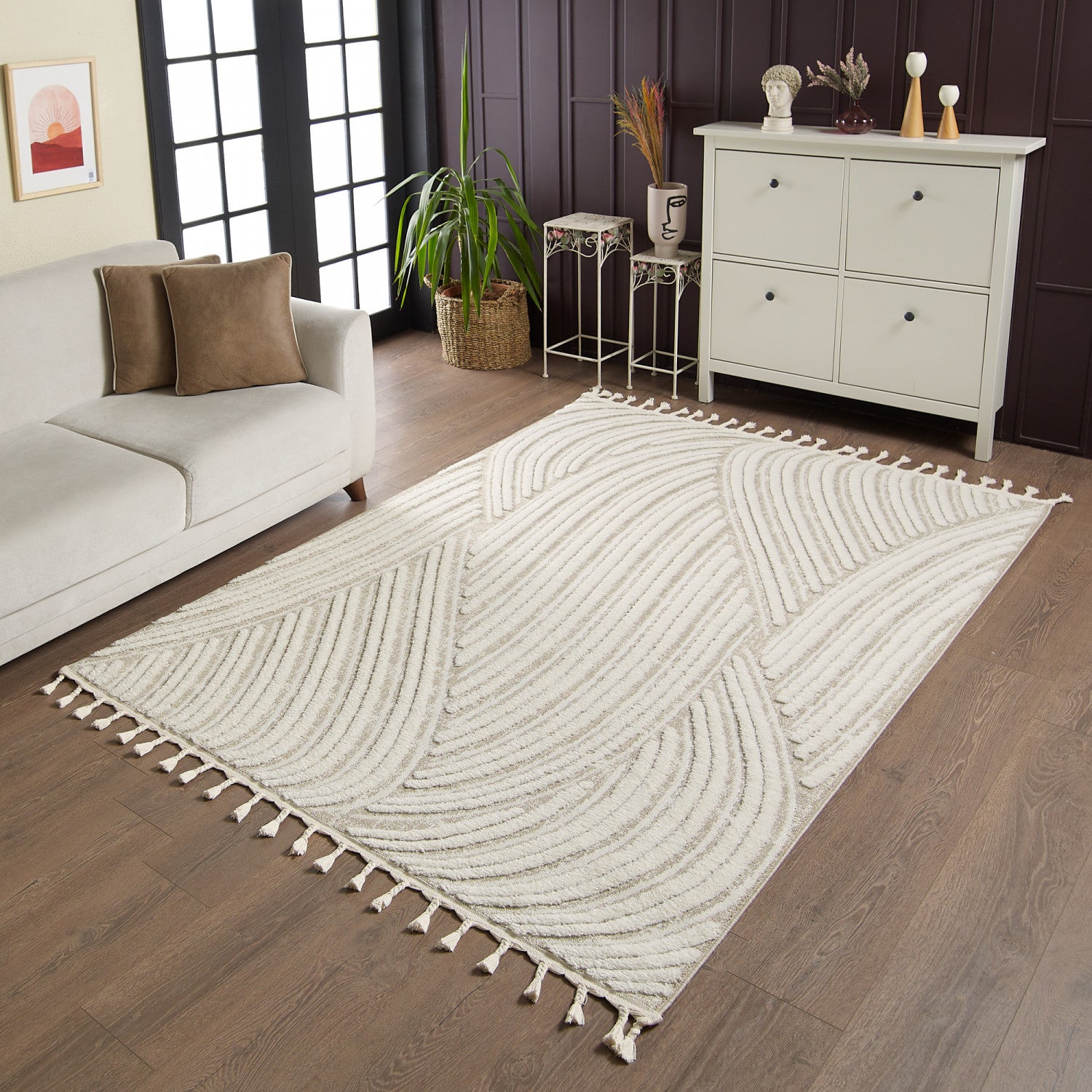 This beautiful shag area rug features an exquisite wavy design and a neutral light cream pile. Whether you are looking for a stunning centrepiece for the living room, a comfortable nursery rug for the bedroom, or a cozy spot to place your feet on at the dinner table, this 3D hi-low geometric carpet will not disappoint. The plush and dense pile of this carpet measures 0.67 inches (17 mm) in height. The use of 100% polypropylene material and fine European weaving technology ensures this rug looks great over time.