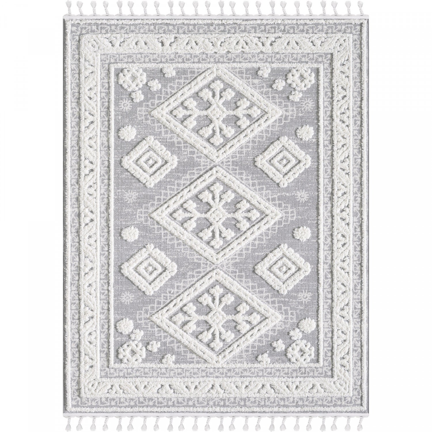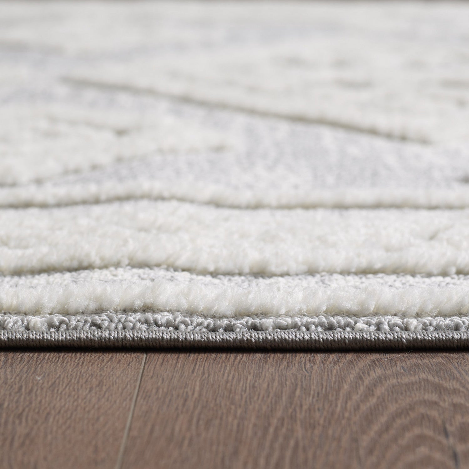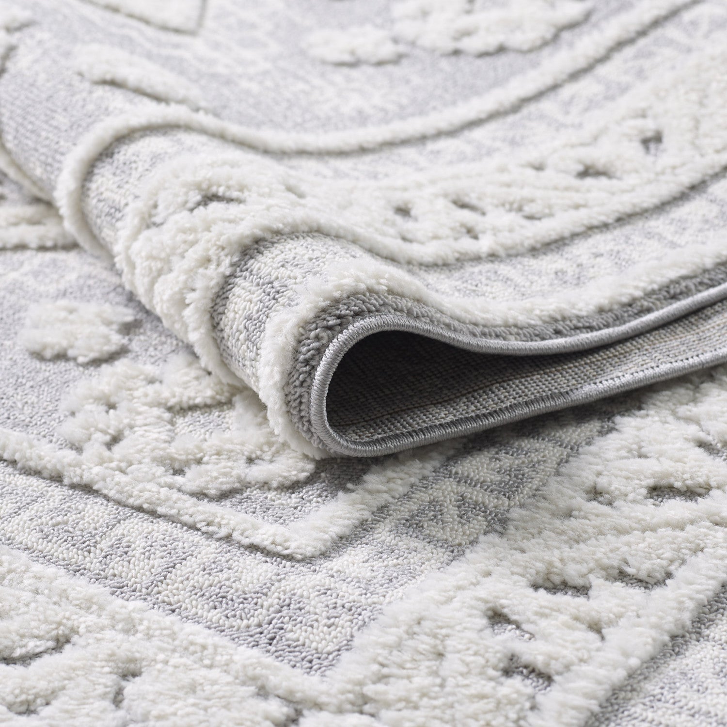 This beautiful shag area rug features an exquisite Medallion Geometric design and a neutral light cream and grey pile.