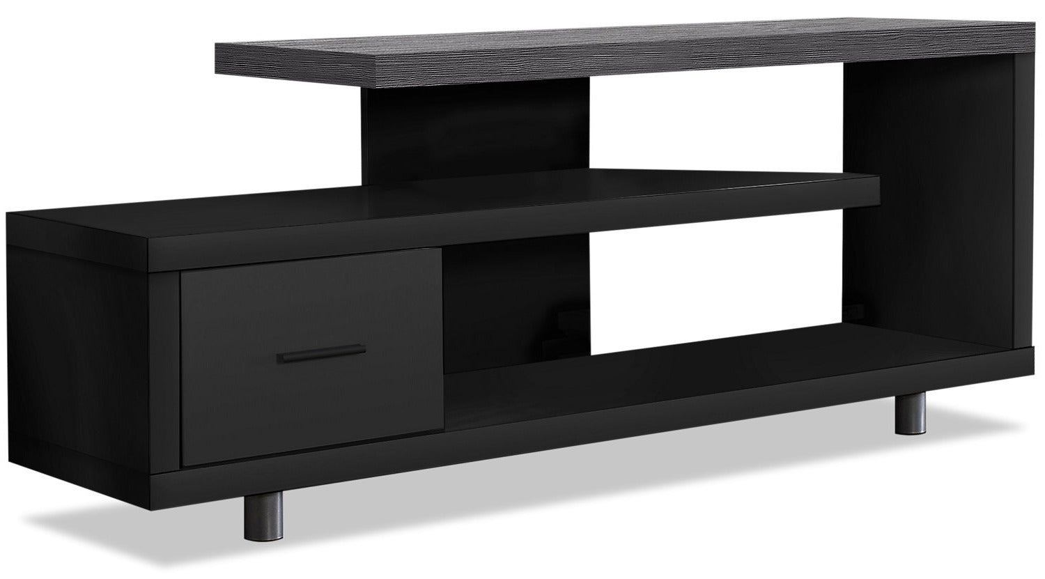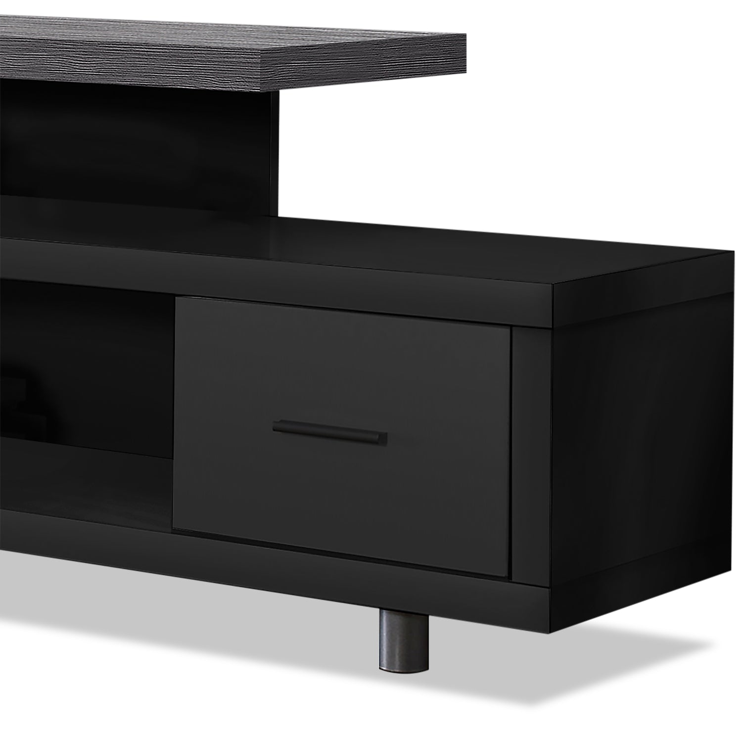 Watch your living space take shape when this Art Deco-inspired Rene TV stand is introduced. Set in a rectangular 'G' shape, the top shelf extends and overhangs above the second shelf, which is suspended over the bottom shelf. Strong and sturdy, this stand is constructed with thick panels in a grey woodgrain-look for the top shelf with black finish on all other surfaces. The shelves provide ample room for media consoles and home decor items, while the drawer keeps batteries and remotes tucked away. Give your room a little extra style with the chic look of the Rene TV stand.