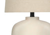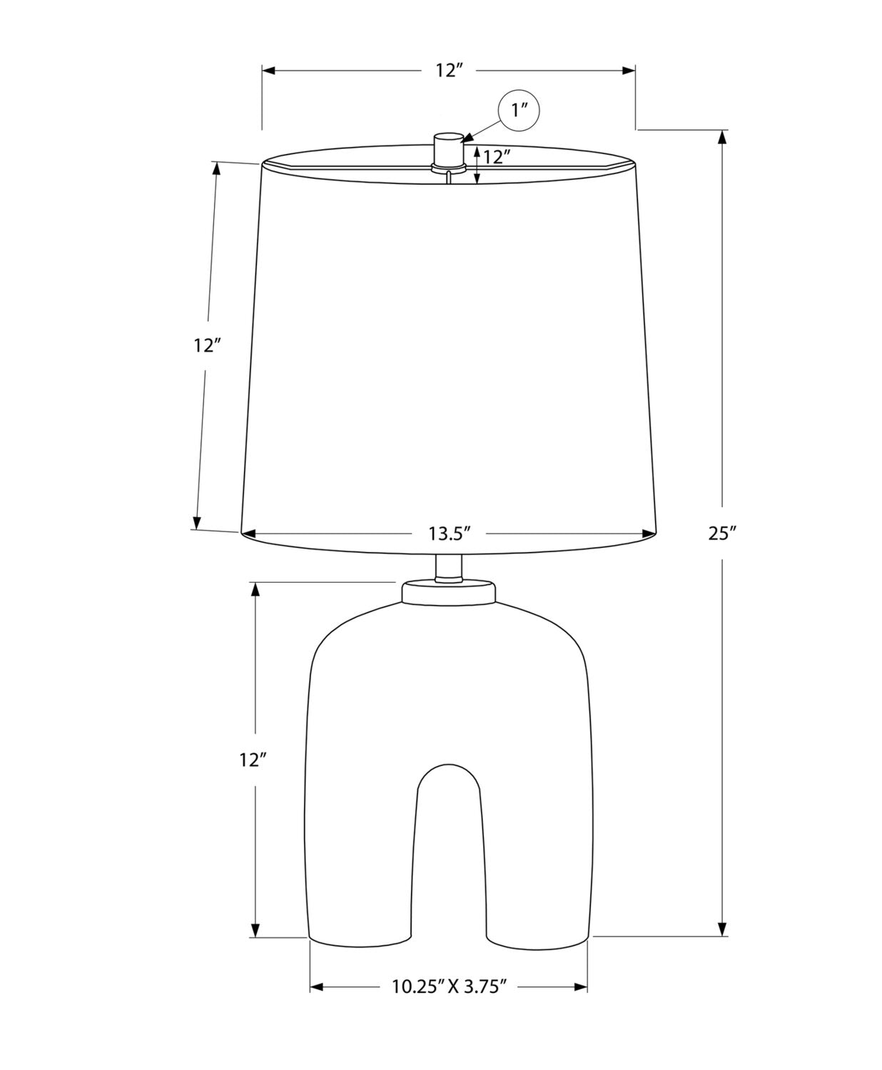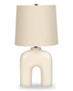 The design brings modern whimsy with this trendy 25"h table lamp that packs a big punch. Featuring a unique cream resin arch-shaped base with a tapered drum beige linen shade and black finial on top, this stylish decorative accent is crafted to brighten your office, living room, or bedroom. The 3-way switch housing a single bulb (not included) for a maximum output of 100W/120V, allows you to adjust the ambiance of a room to your desired level of lighting. Attached with a convenient 5ft transparent cord, this versatile lamp can be placed on a side or end table, a nightstand or a bedside table to bring a distinctive, yet fun look to a contemporary space. Made with quality materials, this lamp includes a 2-year limited warranty against any manufacturer's defects for a worry-free purchase.