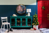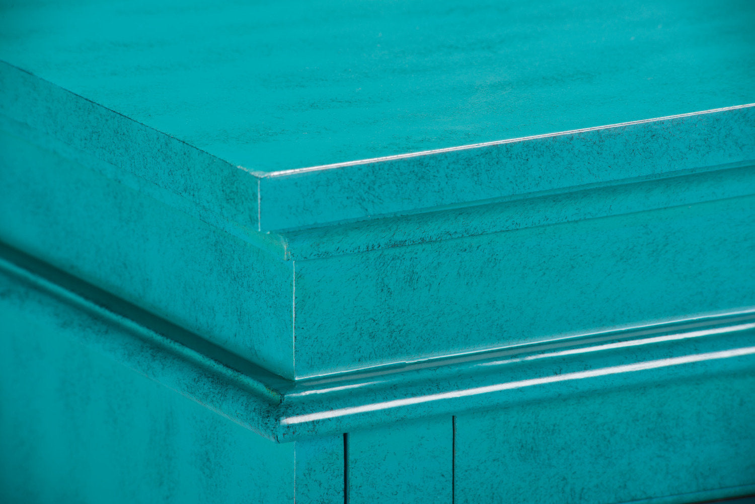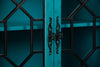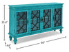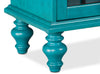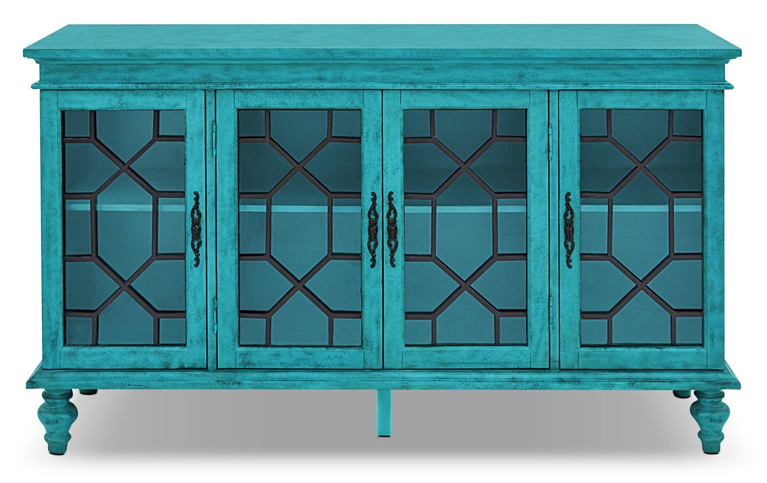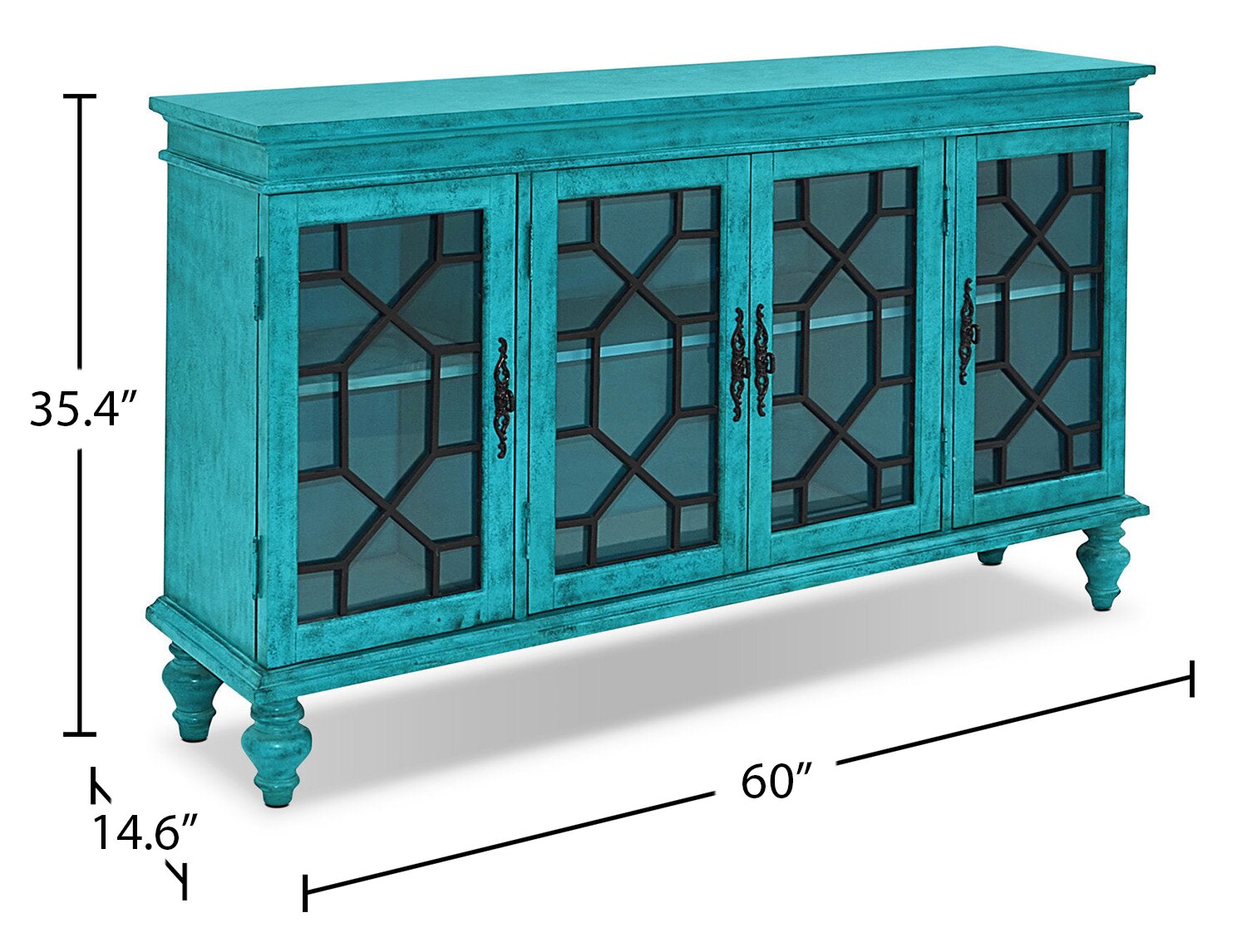 Your home will radiate with the beauty of this Rigolet accent cabinet. Swathed in a striking blue hue, the cabinet is sure to capture the attention of your guests and make a lasting and colourful impression. Tempered glass doors with metal detailing accentuate the Mediterranean style of the furniture piece. Display your teapot collection on the shelf enclosed behind the cabinet's four doors. What's more, intricate hardware and bun feet add the finishing touches to this exquisite accent cabinet.