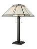 This Rivers table lamp features iridescent blue glass that adds more vibrant color when lit. Displaying a classic shape and design, the artful glass shade brings a major dose of vintage charm. The square bronze finished base provides additional stability. This is an ideal lighting solution for any room's decor. An excellent solution next to a bedside or favourite reading chair, this Rivers lamp will provide your family with many years of reliable, stylish service. li> Hand-blown lamp shade presents a beautiful display with major modern design.