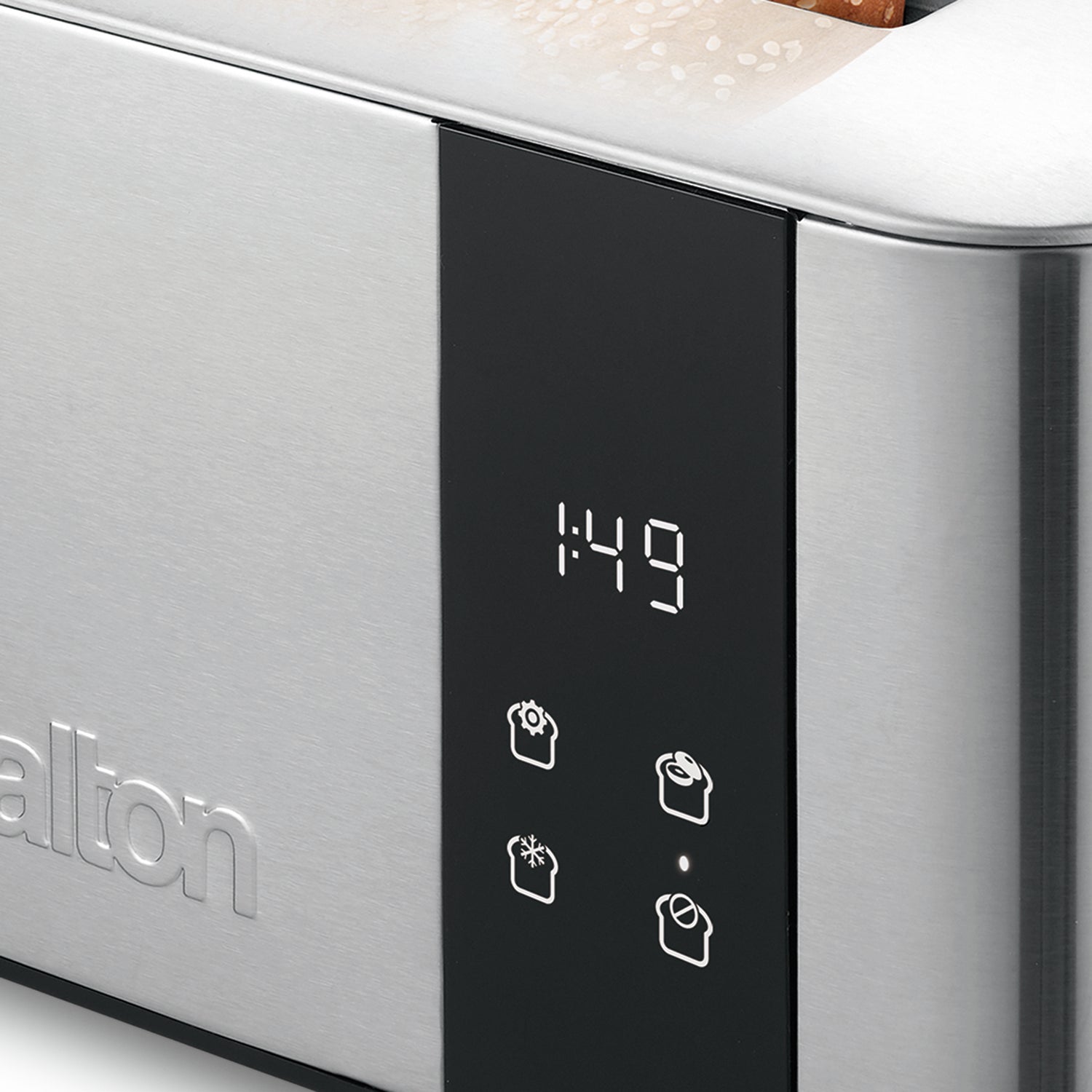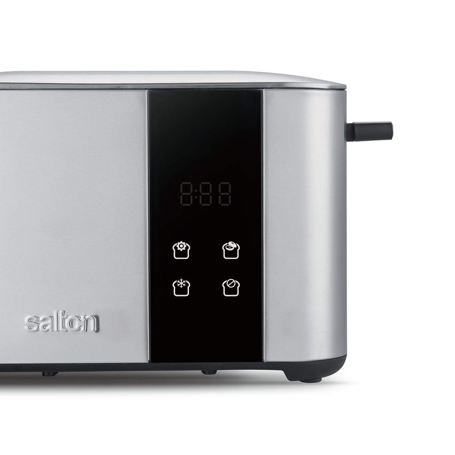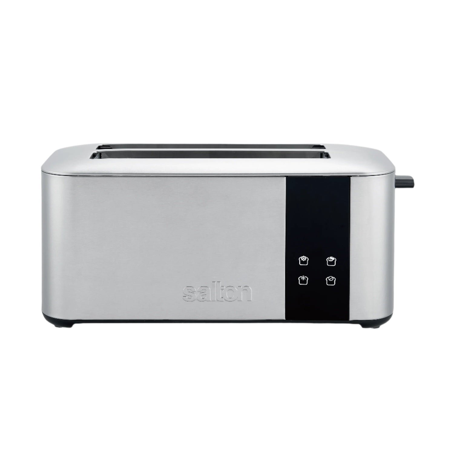 The sleek style of the Salton Digital Long Slot 4 Slice Toaster will enhance any countertop all the while saving space. One size fits all! The long slot design allows you to toast any size waffles, bagels, and artisan breads. The extra wide slots can accommodate both thick and thin slices and the electronic sensor ensures consistent results every time. With variable browning control and a stylish, modern design, this new take on a classic appliance is a kitchen must-have!