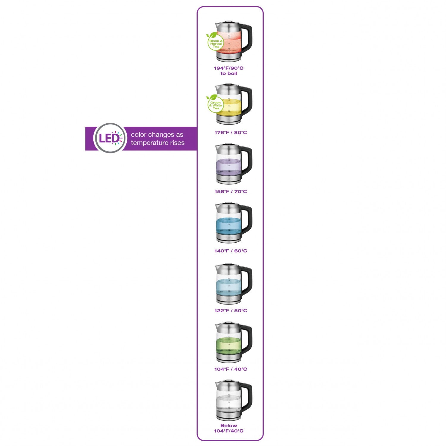 Elegant. Stylish. Sleek. This kettle can be used to boil water and steep your favorite tea at the exact temperature required. The 7 pre-set temperatures adapt to a variety of teas; from oolong to chai, herbal to black. The 360 degree swivel base with cord storage allows you the convenience of cord-free serving and a clutter-free counter. The LED lights change as the temperature rises to indicate the temperature of water the kettle has reached. The perfect cup of tea is at the press of a button!