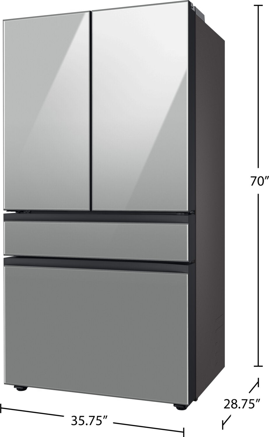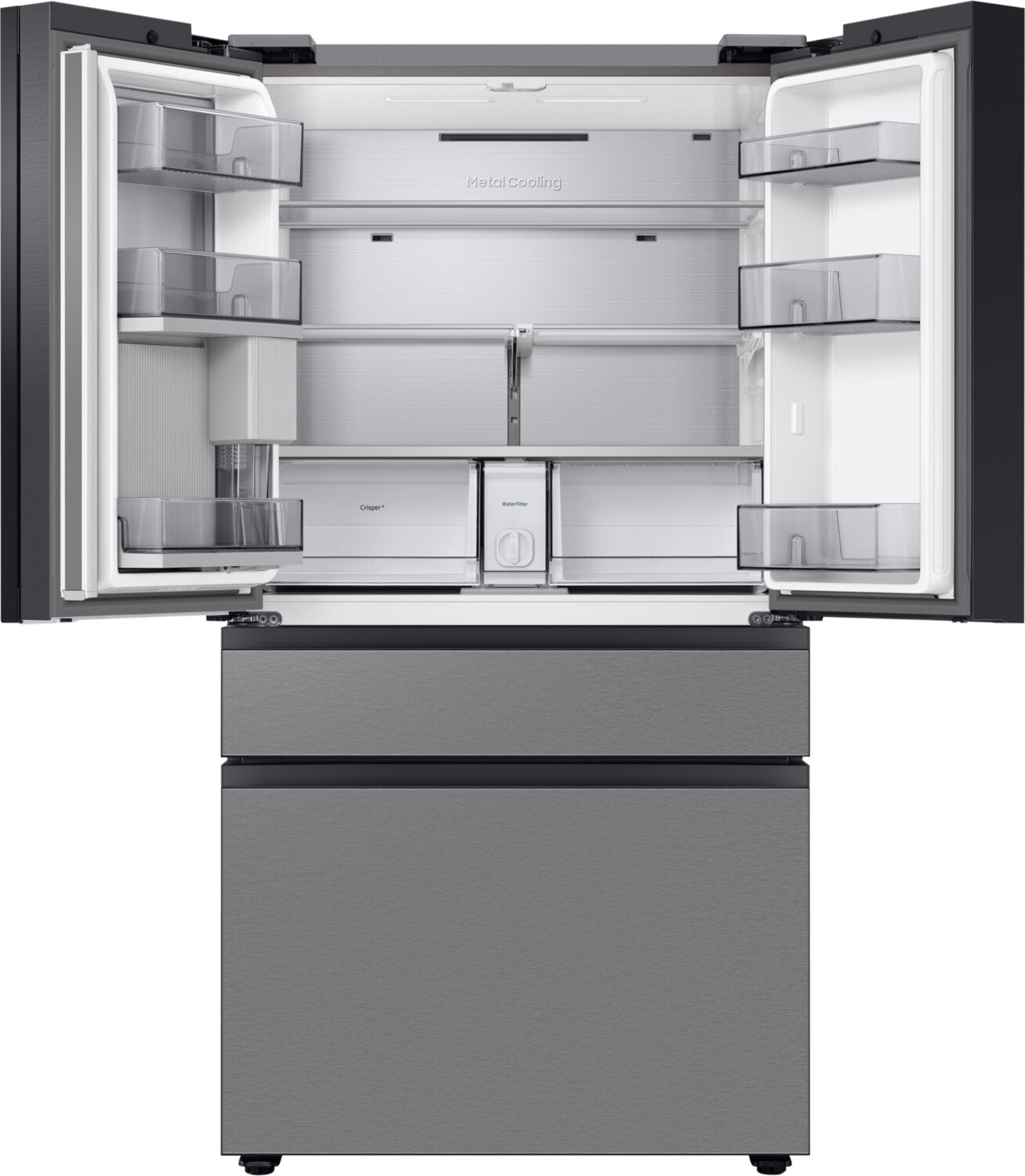 Enjoy flexible food storage and superb style with this Samsung Bespoke refrigerator. The FlexZone™ drawer temperature can be adjusted to cool everything from fruits and veggies to meat platters, while an integrated beverage centre dispenses filtered water right to either your glass or the built-in automatic-refill pitcher. Stainless steel door panels give a sleek look and can be swapped out with multiple other colour options to create seemingly endless combinations and allow you to make this fridge the centrepiece of your kitchen decor.
