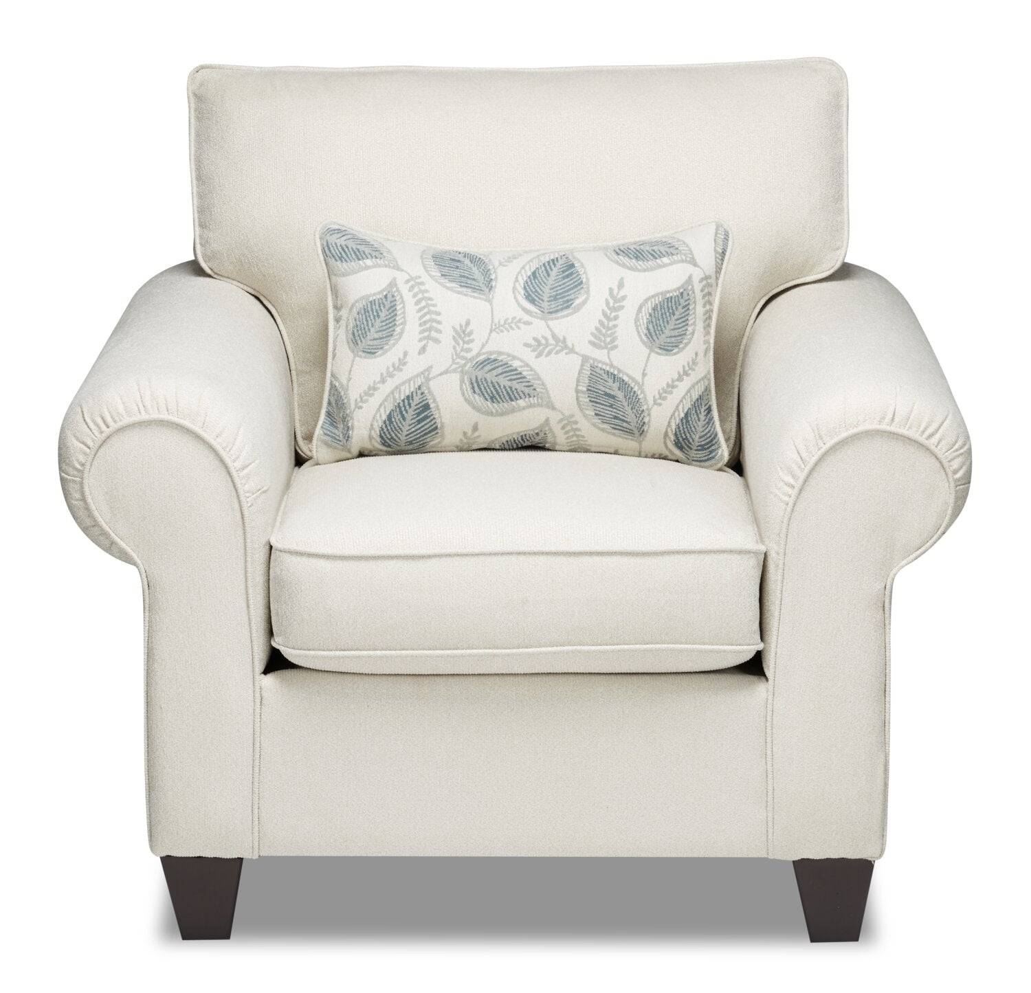 Ready to play host for your friends and family, this ecru-coloured Scarlett chair turns your living room into the perfect entertaining space. Chenille fabric covers the furniture frame with a light beige hue to create a cozy space. Matching fabric piping outlines every edge of this piece, including the high-density foam cushions you'll want to relax on. Classic features like rolled armrests allow this piece to pair well with many different decor styles. With a throw pillow for extra comfort, this Scarlett chair turns your home into an inviting oasis.