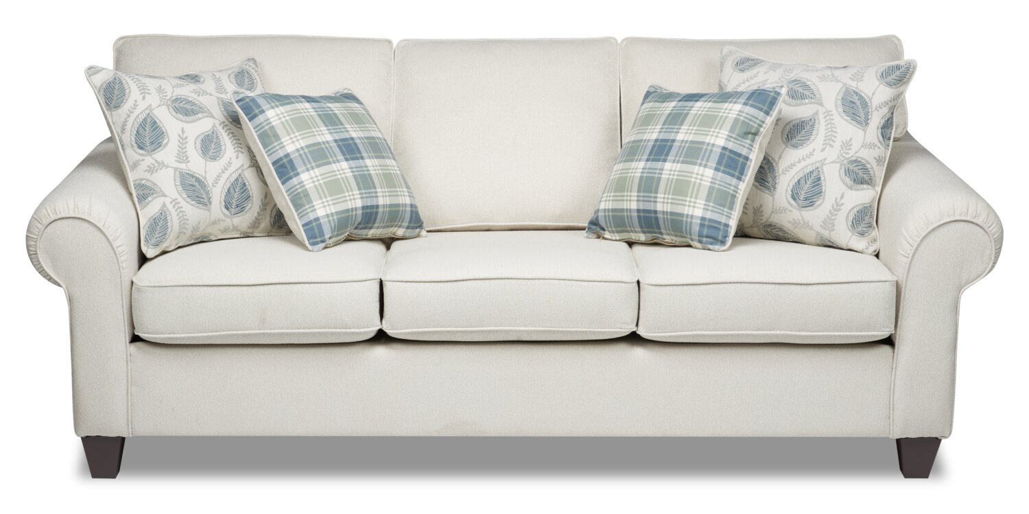 Made in Canada Scarlett 87" Chenille Fabric Sofa with Rolled Arms and Accent Pillows - Ecru Beige