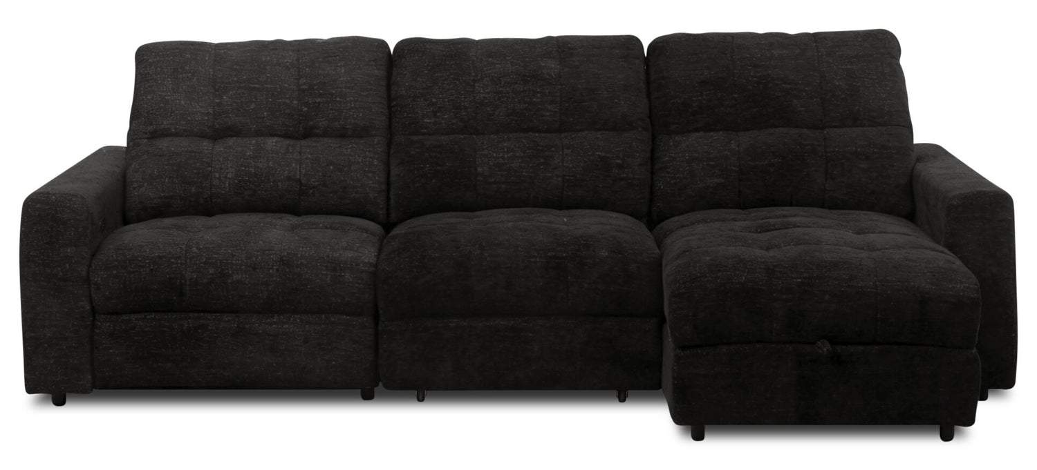 Transform your space with this Elevate three-piece sectional. Featuring a modular design with sliding chairs and a storage chaise, this piece will surely be a unique addition to any home. Constructed with comfortability in mind, it’s swathed in soft chenille fabric, boasts high-density foam cushions and features power sliding chairs. With a quick press of a button, you can stretch out your legs and let relaxation wash over you as you enjoy your favourite film or show. Allow the Elevate to become your new versatile and comfortable companion at home.