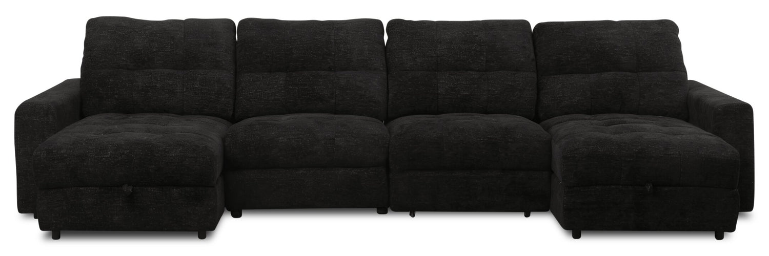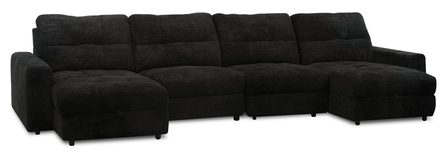 Transform your space with this Scott Living Elevate four-piece sectional. Featuring a modular design with two storage chaises and two sliding chairs, this piece will surely be a unique addition to any home. Constructed with comfortability in mind, it’s swathed in soft chenille fabric, boasts high-density foam cushions and features power sliding chairs. Store extra blankets and pillows in the storage chaises and take advantage of the extended seating by hosting overnight guests. Allow the Elevate to become your new versatile and comfortable companion at home.