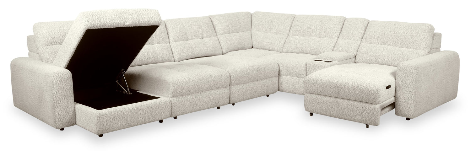 Transform your space with this Scott Living Elevate seven-piece sectional. Featuring a modular design with power sliding chairs, storage chaise and console, this piece will surely be a unique addition to any home. Constructed with comfortability in mind, it’s swathed in soft chenille fabric, boasts high-density foam cushions and features power sliding chairs. With a quick press of a button, you can stretch out your legs and enjoy great drinks and snacks thanks to the dual cupholders and storage console. Allow the Elevate to become your new versatile and comfortable companion at home.
