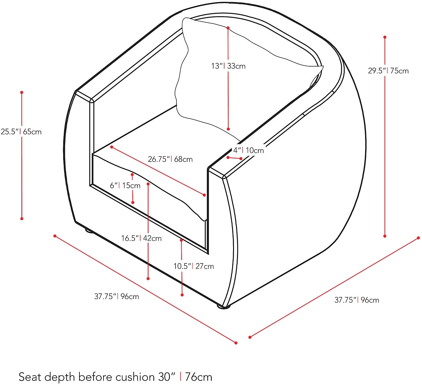 - Chair (HxWxD): 29.5" x 37.8" x 37.8" (75 cm x 96 cm x 96 cm)