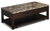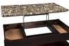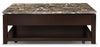 Enrich your home with this fabulous and functional Sicily coffee table. Finished in a deep chocolate colour and featuring a faux-marble tabletop in shades of brown and dark grey, this piece is designed to enhance your living space. Underneath the impressive lift-top you’ll find three spacious compartments for home essentials, while the table’s caster wheels make moving this piece convenient. Complete the look by pairing this table with the matching end table (sold separately).