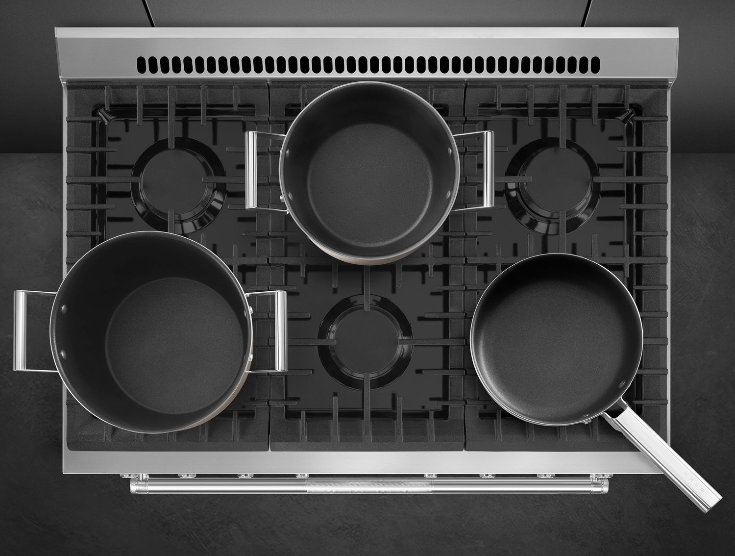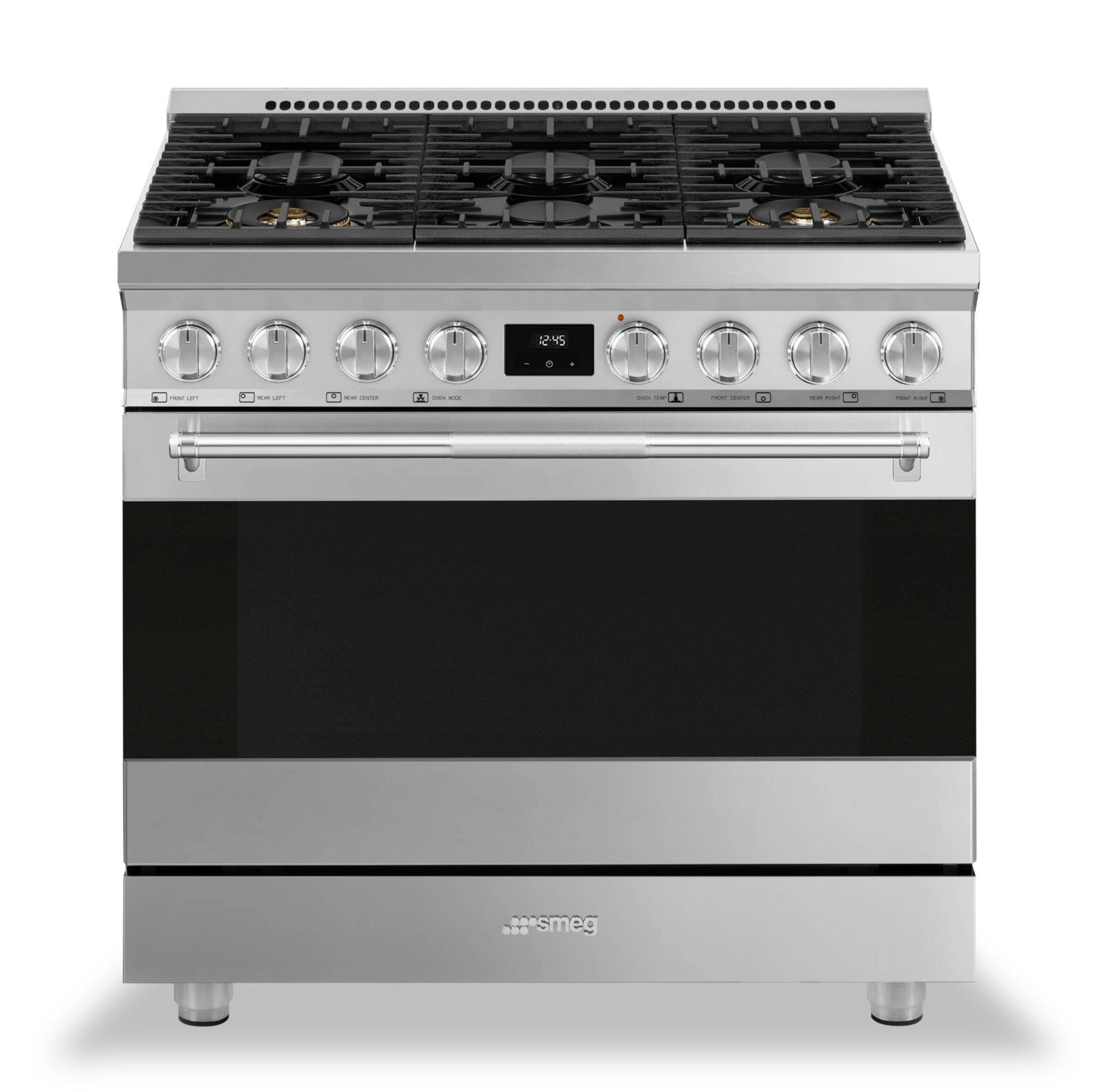This gas range from Smeg features six sealed burners for plenty of cooking space and power. Continuous cast iron grates on the cooktop ensure easy transport of pots and pans from burner to burner. Plus, the EverClean enamel oven cavity and black enamel cooktop make keeping this range sparkling a breeze.