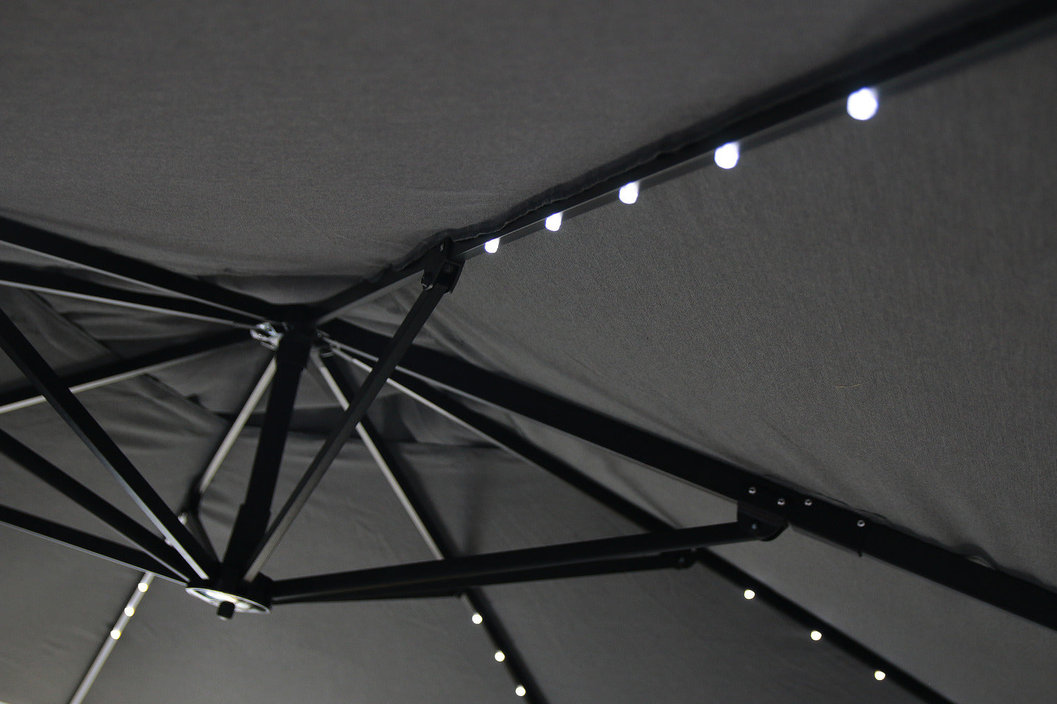 Cool down your days and light up your nights with the Solar cantilevered patio umbrella. A wide grey hanging umbrella expands up to 137 inches to create a welcoming shady spot on your deck. The hanging design means extra space under the shade without a pole getting in the way. A solar panel on the top stores energy to power to light up the built-in LED lights; with 5 lights on each spoke you can add some extra illumination to your shady days or light up your night. Add the Solar umbrella to your yard, and keep the party going all day and into the night.