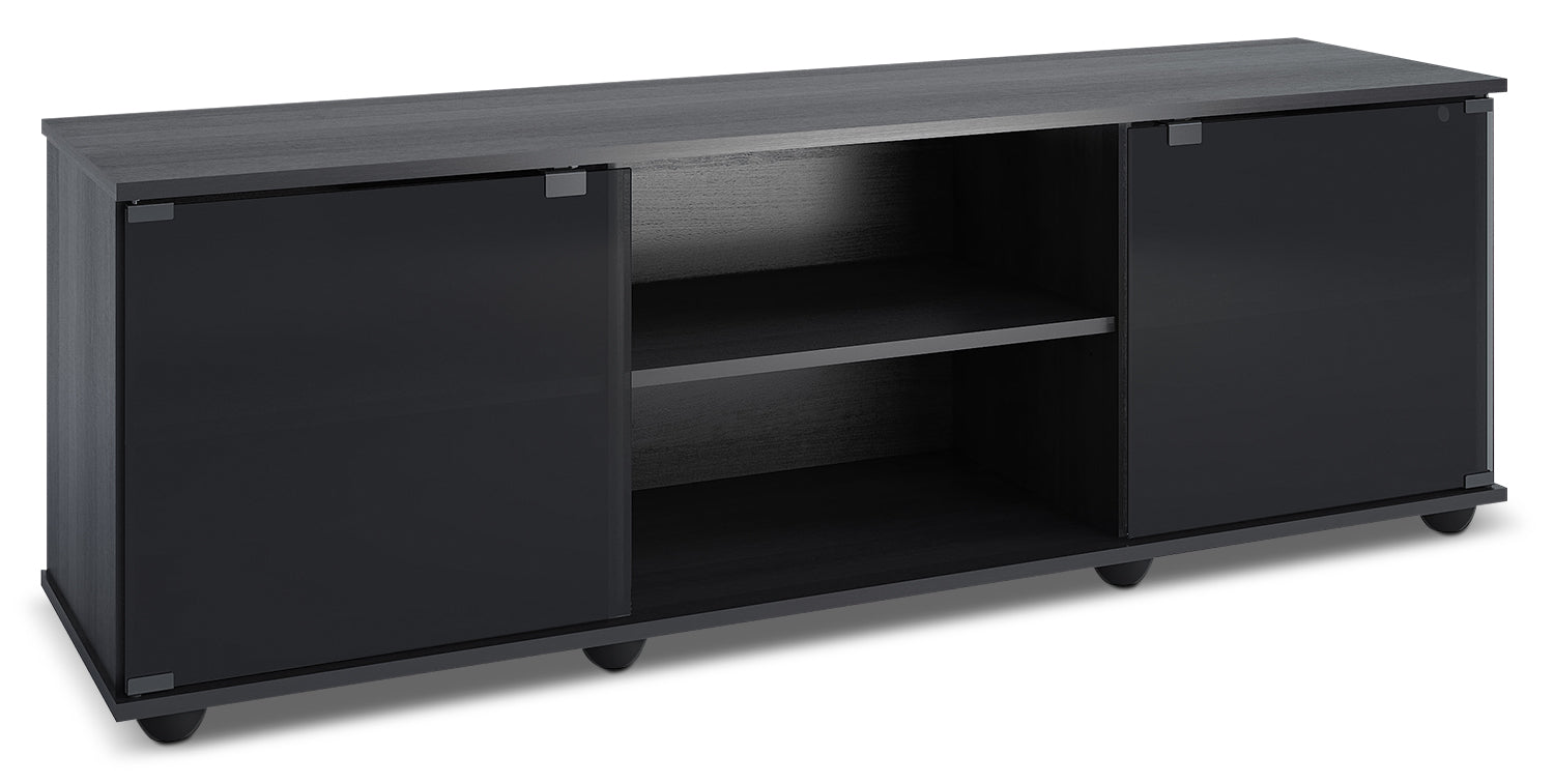 Give your big screen TV a home as stylish as it deserves with this Sonax 60-inch television stand. Finished in raven black, this low-profile stand is sure to match the look of your electronics without appearing too out-of-place or "noisy." In front, three storage locations offer plenty of room to keep your electronics systems, movie collection or TV accessories, including an adjustable centre station. On either end, elegant glass doors with magnetic catches help you keep the look of your entertainment area clean and uncluttered.