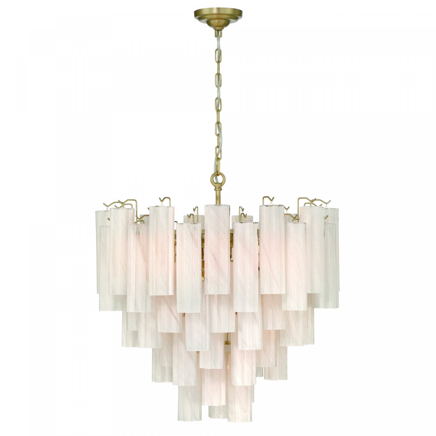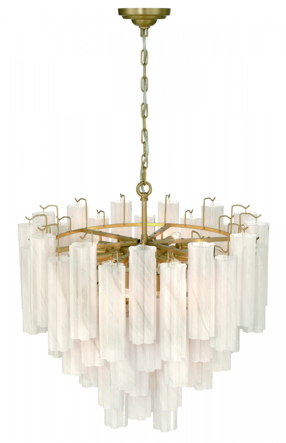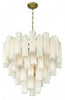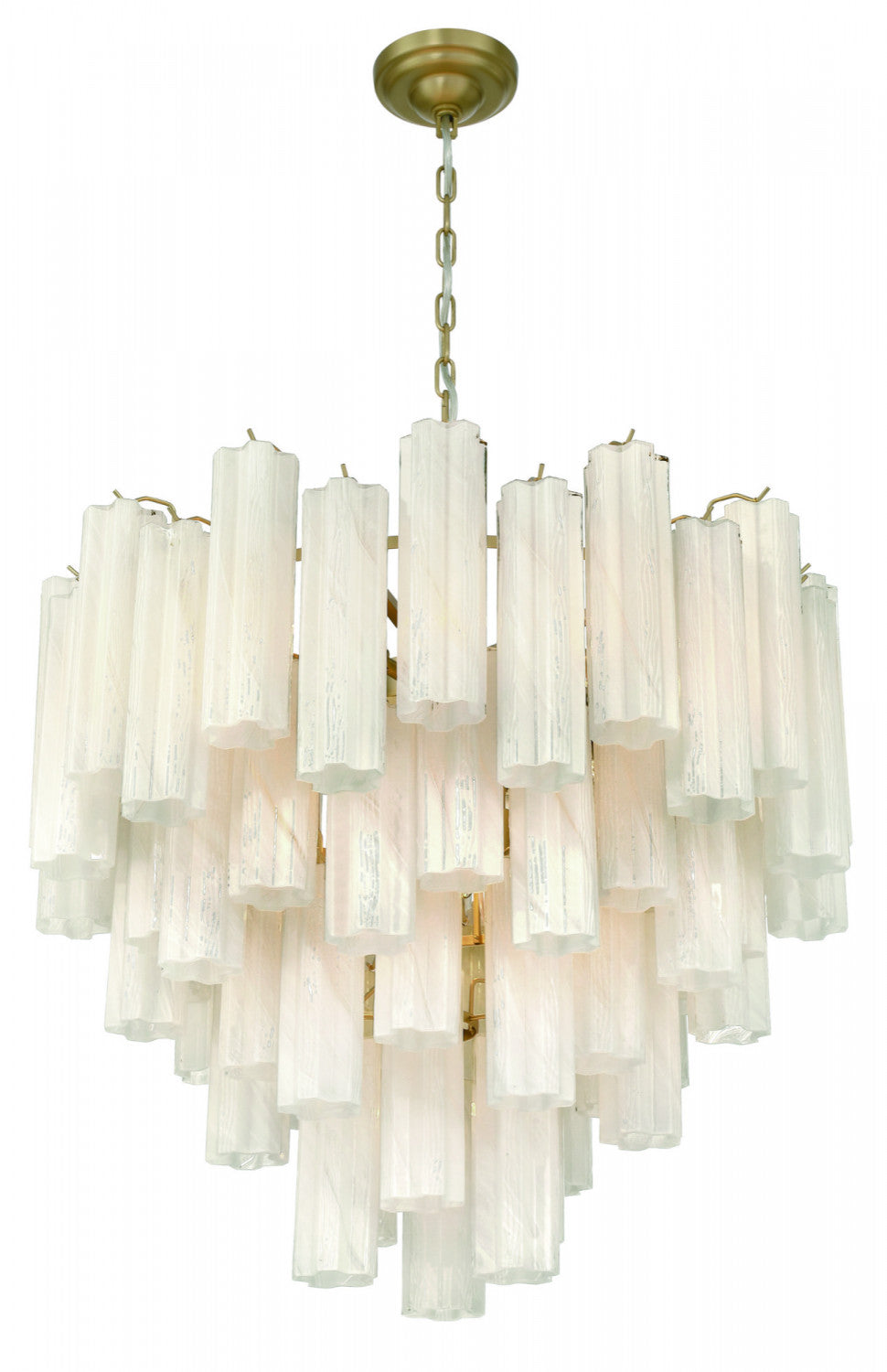 The large chandelier from the sophia collection captivates with its cascading arrangement of ornate “tronchi” style wispy white glassware, reminiscent of shimmering icicles. Each glass element delicately refracts light, creating an enchanting glow, while the warm brass frame provides a refined contrast, evoking a sense of luxury. Perfect for classic and modern interiors alike, this design transforms any space into a haven of timeless beauty.