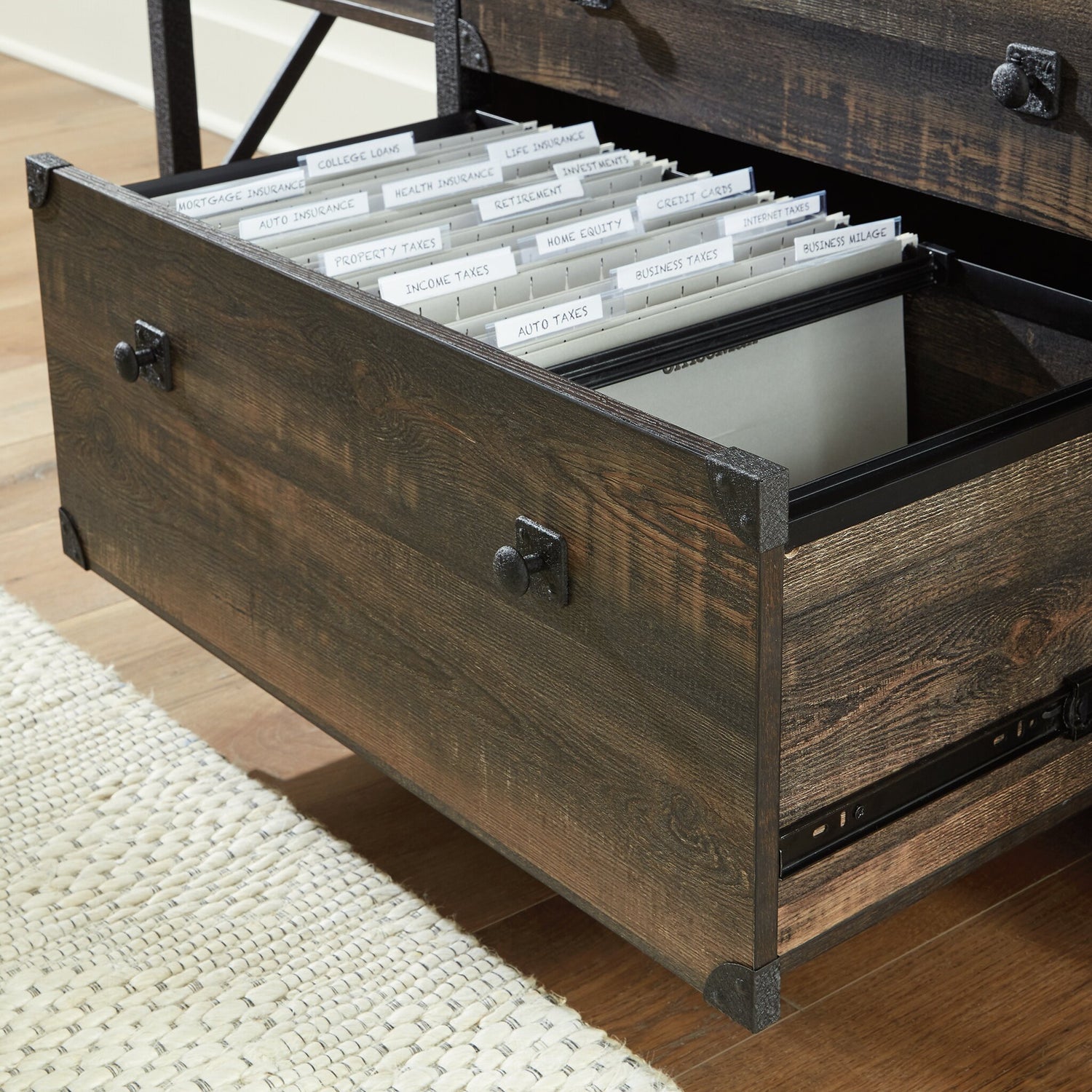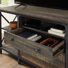 Update the look of your office with the industrial-inspired style and design of this Steel River credenza. This unit features two drawers, perfect for storing video games or DVDs and office supplies, while the large lower drawer can also hold letter-, legal- or European-size hanging files. Plus, there are open storage options with adjustable shelving to accommodate items of various heights. With a textured, powder-coated metal frame, and finished in a dark brown tone, this credenza is sure to stand out in your home.
