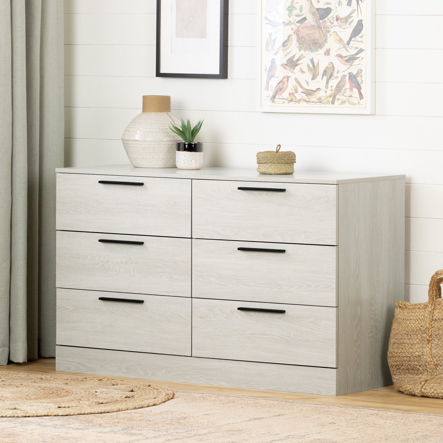 A trendy chest with a contemporary-modern look. This modern style dresser gives you functional storage and very simple lines… so you can now get that sleek look for your bedroom. Six drawers for clothes drawers are an easy way to see what’s in the chest – and putting things away is simple, so it doesn’t look like your clothes were left all over the room. A six drawer dresser is the ideal companion piece to an armoire. Because the slides are made of metal, each drawer can hold up to 25 pounds. Easy to access storage another very useful feature of this chest – aside from the handy drawers – is the large top surface. Since the piece itself is lower, the top is within easy reach and large enough to hold lots of things. It’s a favorite place for decorative items and those body care products you use all the time.