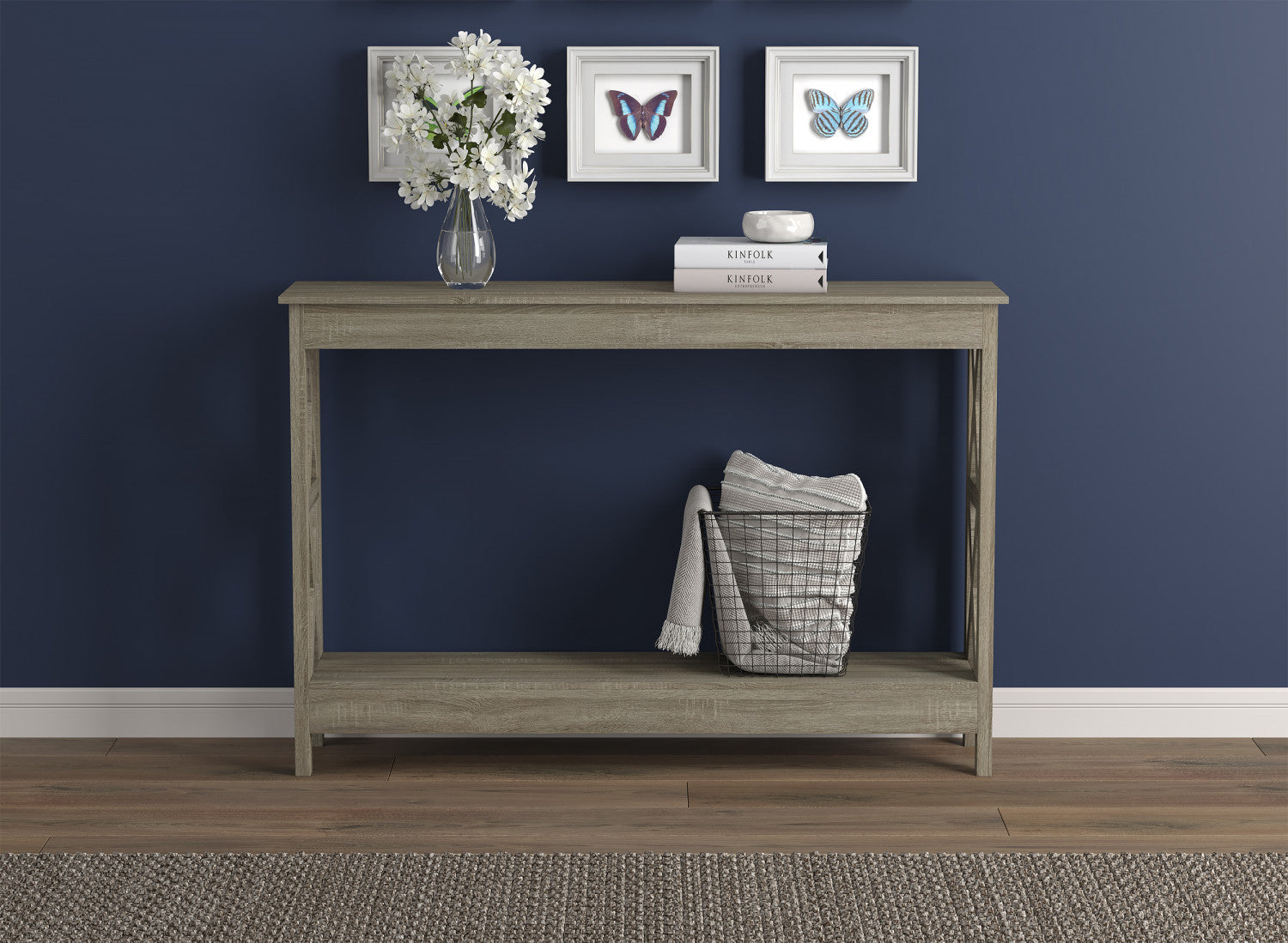 Add a touch of rustic elegance to your home with this 47. 25" console table, featuring a generous surface and a practical lower shelf. Its versatile design makes it the perfect accent for entryways, living rooms, hallways, or bedrooms—seamlessly complementing both traditional and contemporary interiors. The reclaimed wood finish brings natural charm and character, creating a cozy, lived-in feel. Use the top to showcase your favorite decorative pieces, from framed photos and candles to floral arrangements or a statement lamp. The open shelf below offers extra room for books, baskets, or everyday essentials, keeping your space tidy and beautifully styled. Whether placed behind a sofa or against a hallway wall, this console table effortlessly balances style and function. Built with lasting durability in mind, it’s a reliable and timeless addition to your home. Let it become a favorite spot that reflects your personal style while enhancing the heart of your space.