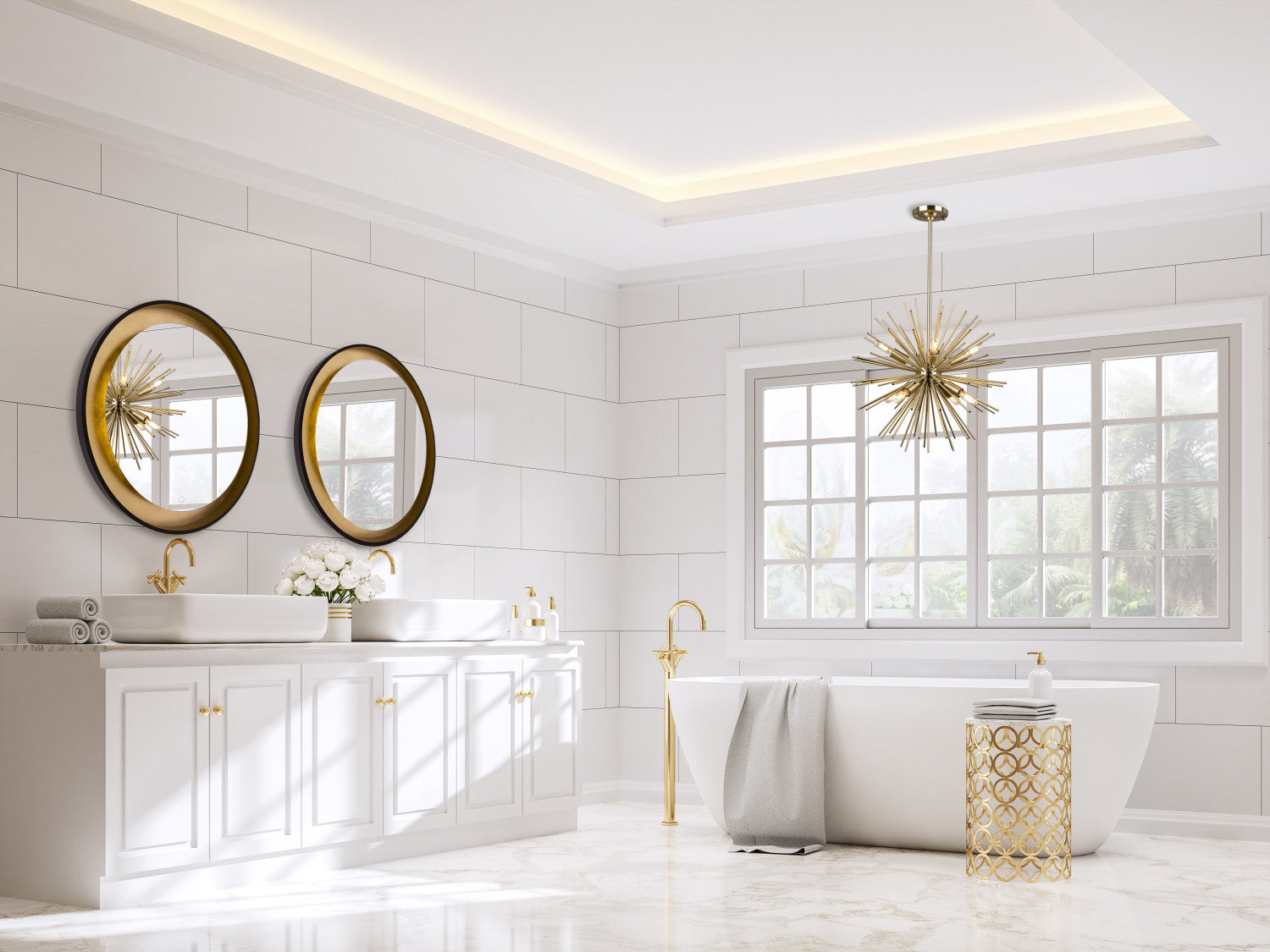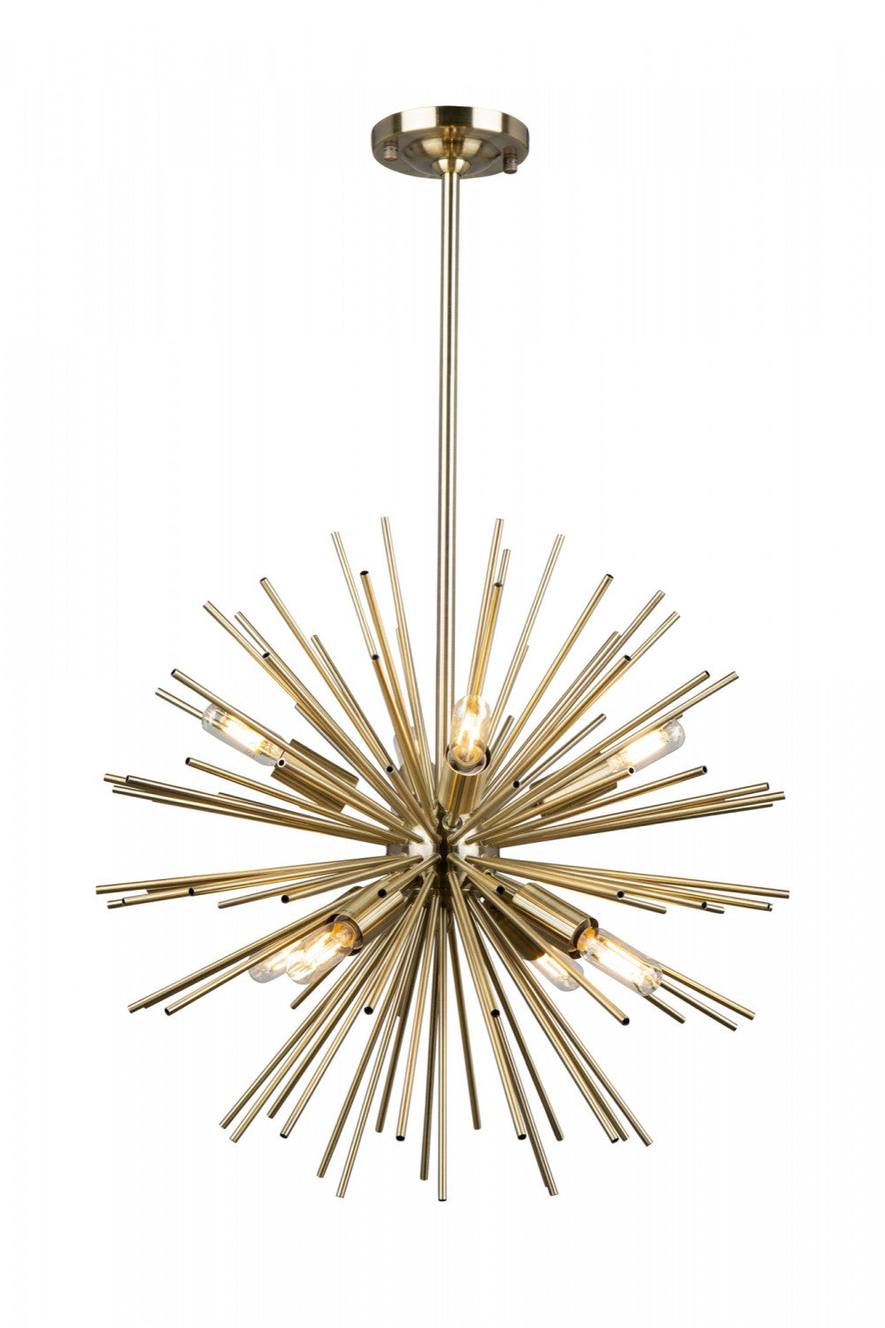 The Sunburst Collection 8 light chandelier is unique and a definitely beautiful focal point. Features harvest brass thin hollow rods attached to a chrome center. (also available in aluminum color).