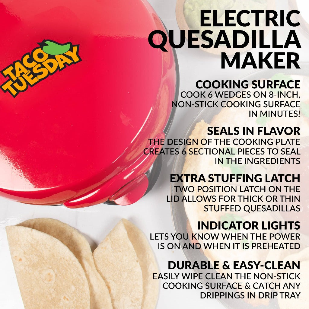 Bring the fiesta right into the kitchen and create crispy and delicious quesadillas quickly. The extra stuffing latch allows for more filling and the plate design creates 6 wedges that seal in the flavor. With the non-stick surface cleanup is simple. Cooks quesadilla in just minutes.