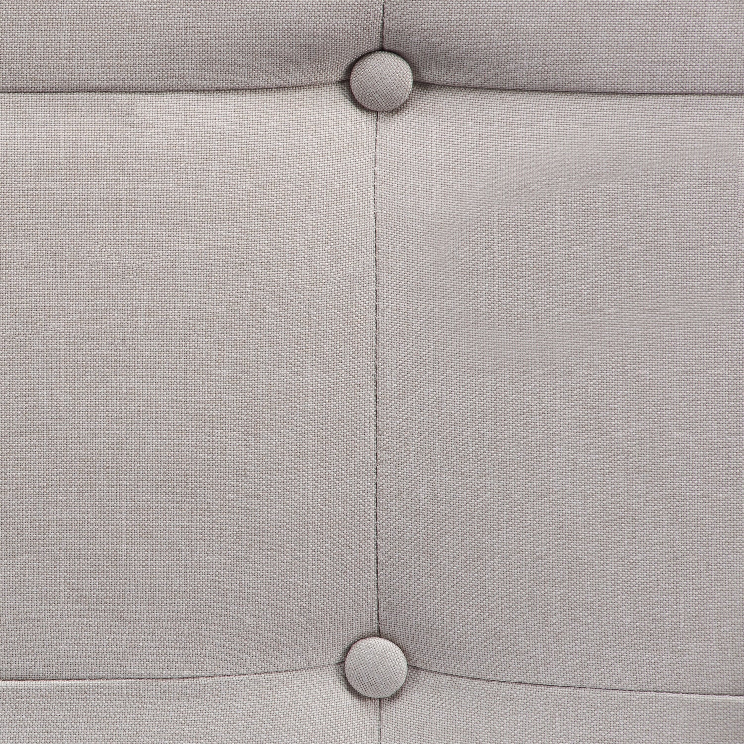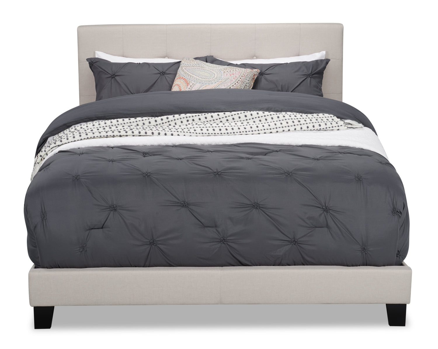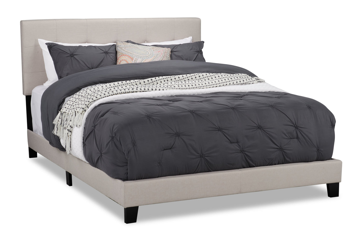 Savour the softness of this Tara full bed. The tall headboard and apron are each upholstered in an elegant, beige linen-look fabric. This soft material lightens your room while creating a cozy space you'll look forward to nestling up against. Button-tufting and square accent stitching also provide traditional touches. However, the clean-cut design and black wooden legs mean this fine slumbering space will look equally chic in a modern setting.