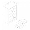 Storage for your clothes. Organize your stuff by sorting your clothes into categories – one for each of the five handy drawers in this chest. The rigid metal slides mean each drawer can hold up to 25 pounds. It’s easy now to put your clothes away, in a storage piece that takes up less space in the bedroom than a horizontal chest. A modern country style piece want to create a cozy bedroom look? Choose furniture from the tassio collection, which is brand new but features a slightly antique look. The old time look will add warmth to any decor!