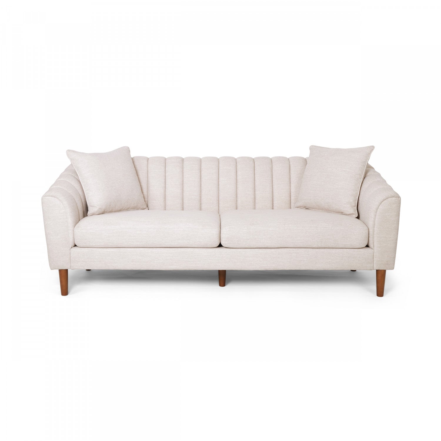Elevate your living space with this contemporary 3-seater sofa,designed for both style and comfort. Upholstered in soft beige fabric,it features elegant channel stitching, sloped arms,and a refined button-tufted back for a polished look. The plush foam cushions and included accent pillows provide cozy support,while the sturdy birch wood frame ensures long-lasting durability. Perfect for any modern home,this sofa blends comfort with timeless sophistication,making it a standout addition to your primary living area.