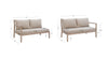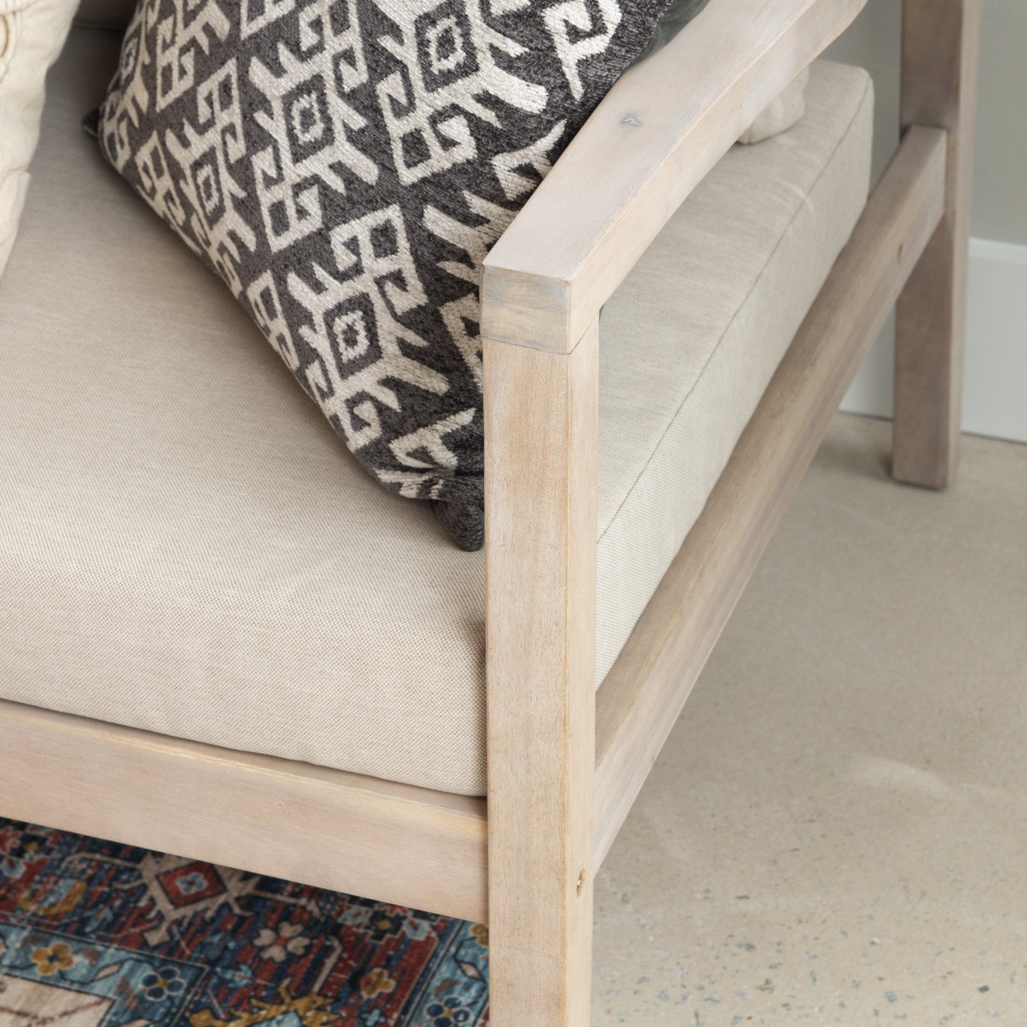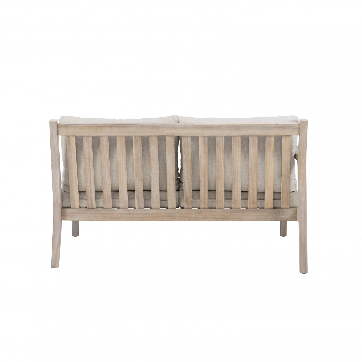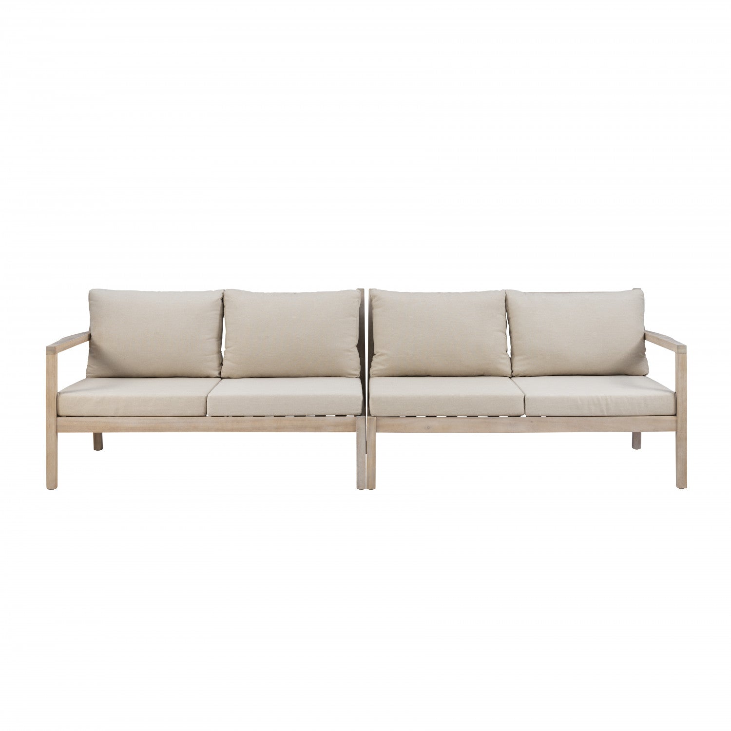 Create a central fixture in your garden by using this pair of loveseats as an extended couch or a sectional with the matching corner seat. Designed to withstand the elements, these are the perfect seating solution for your patio, porch, or roof deck. The high density cushions are upholstered in beige olefin fabric, which is water and uv resistant, while the solid acacia wood frames are also weather resistant and built to last. A natural oil based stain highlights knots and patterns of the woodgrain while providing additional protection. Comfort, durability, and boho style, all in one package.