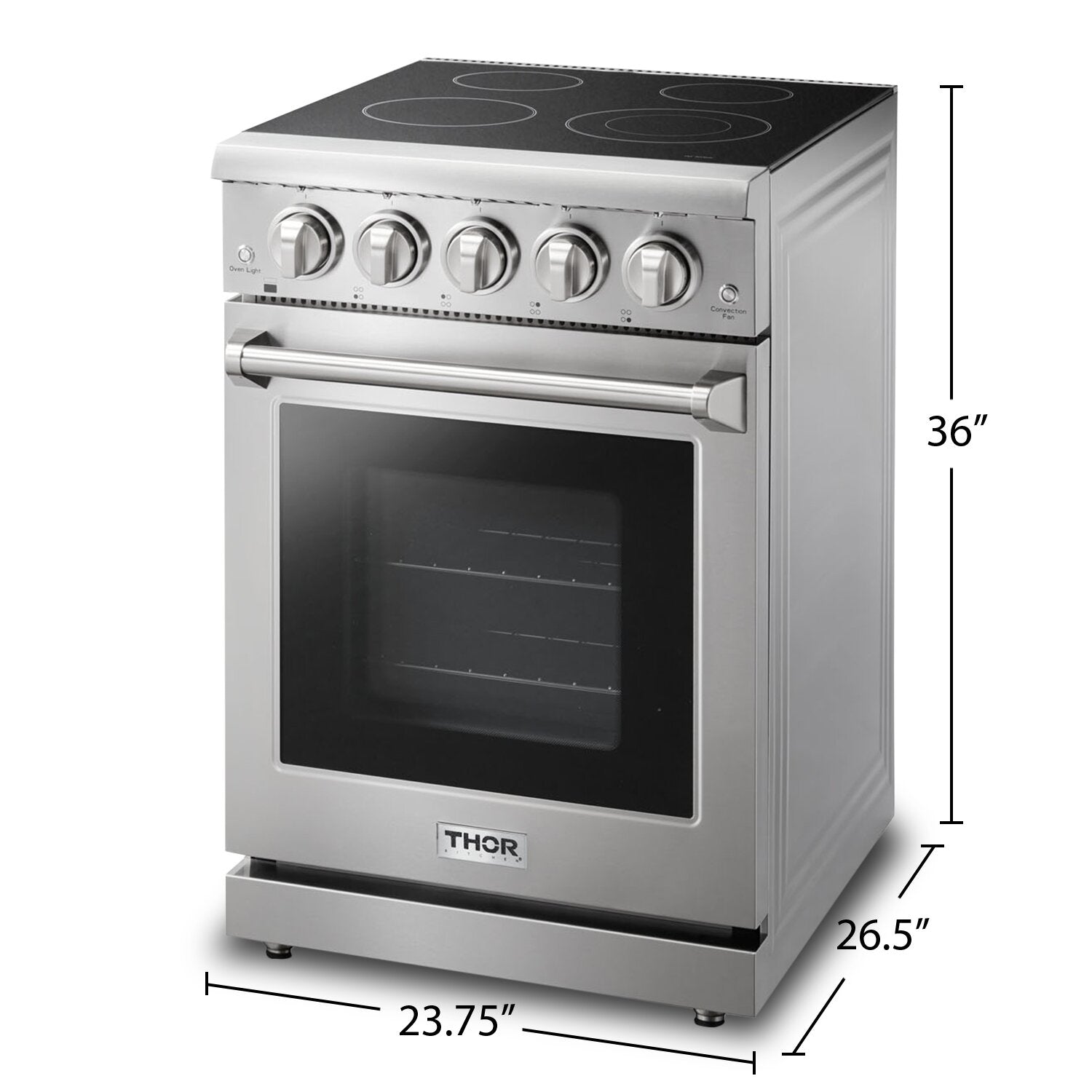 This Thor Kitchen professional-style electric range is designed with powerful features and functionality in mind. A smaller width makes this range an excellent choice for kitchens with limited space, while its 3.73-cubic-foot capacity still provides enough room to accommodate multiple dishes at once. True convection evenly heats your food for thorough results on everything from roast dinners to batches of cookies. Featuring heavy duty metal control knobs and a frameless glass top, this range brings style and durability to your kitchen.
