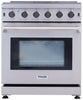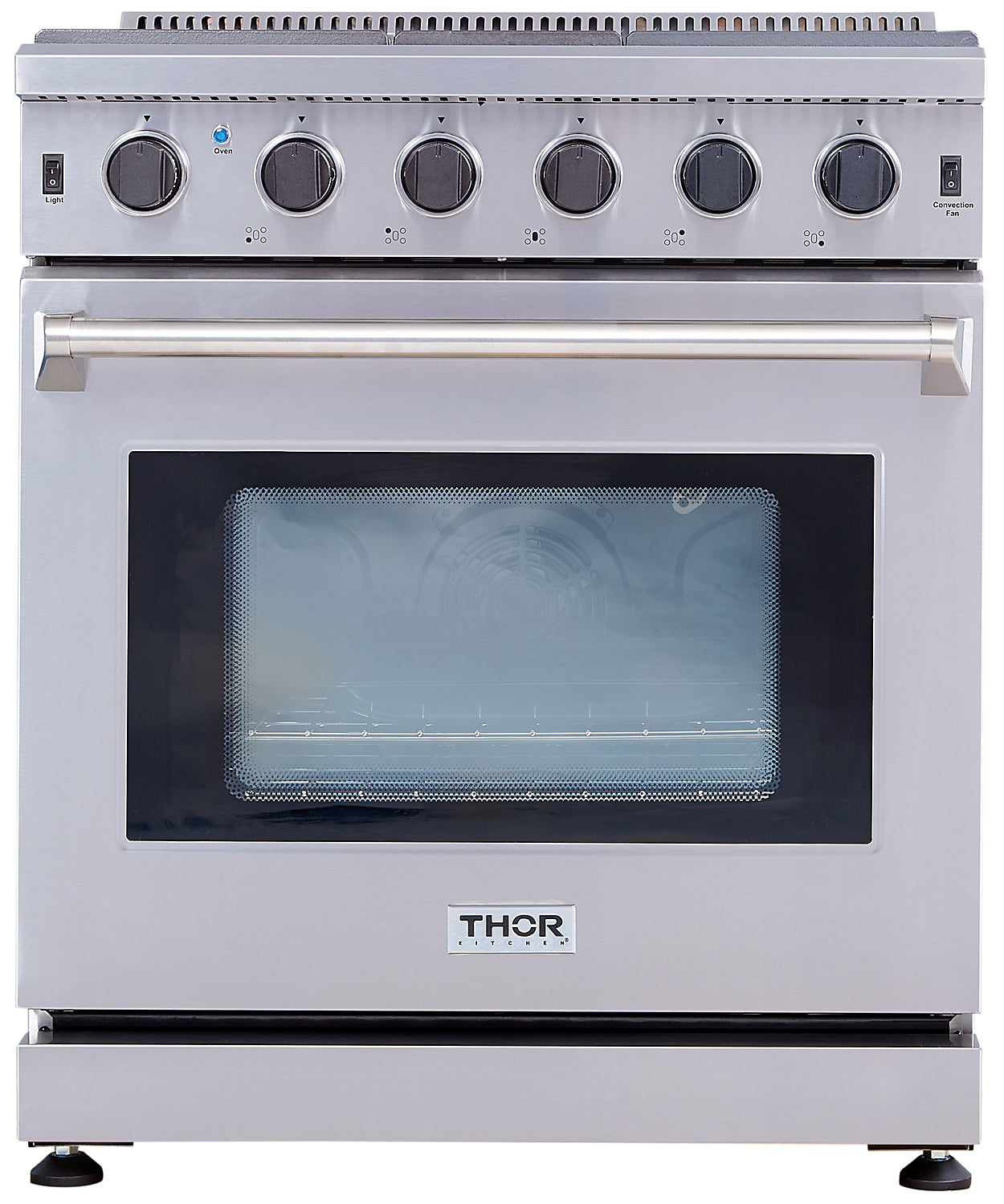 Upgrade your cooking techniques and bask in the professional styling of this Thor Kitchen 30-inch gas range. The freestanding gas range features four sealed burners, and continuous cast-iron grates which allow you to easily slide heavy cookware across the cooktop. An additional centre burner is oval shaped to accommodate large cookware, like a griddle perfect for pancakes. The oven offers 4.5 cubic feet of capacity, easily accommodating a large roast or multiple batches of cookies. Best of all, the commercial quality convection fan circulates heat to maximize even, multi-rack baking.