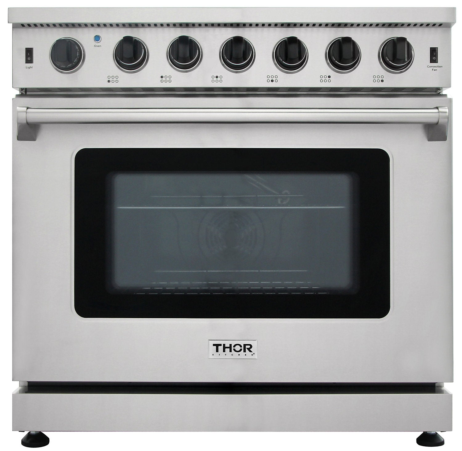 Upgrade your cooking techniques and bask in the professional styling of this Thor Kitchen 36-inch gas range. The freestanding gas range features six sealed burners, and continuous cast-iron grates which allow you to easily slide heavy cookware across the cooktop. The oven offers six cubic feet of capacity, easily accommodating a large roast or multiple batches of cookies. Best of all, the commercial quality convection fan circulates heat to maximize even, multi-rack baking. Plus, the storage drawer is the perfect spot for pots and pans.