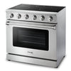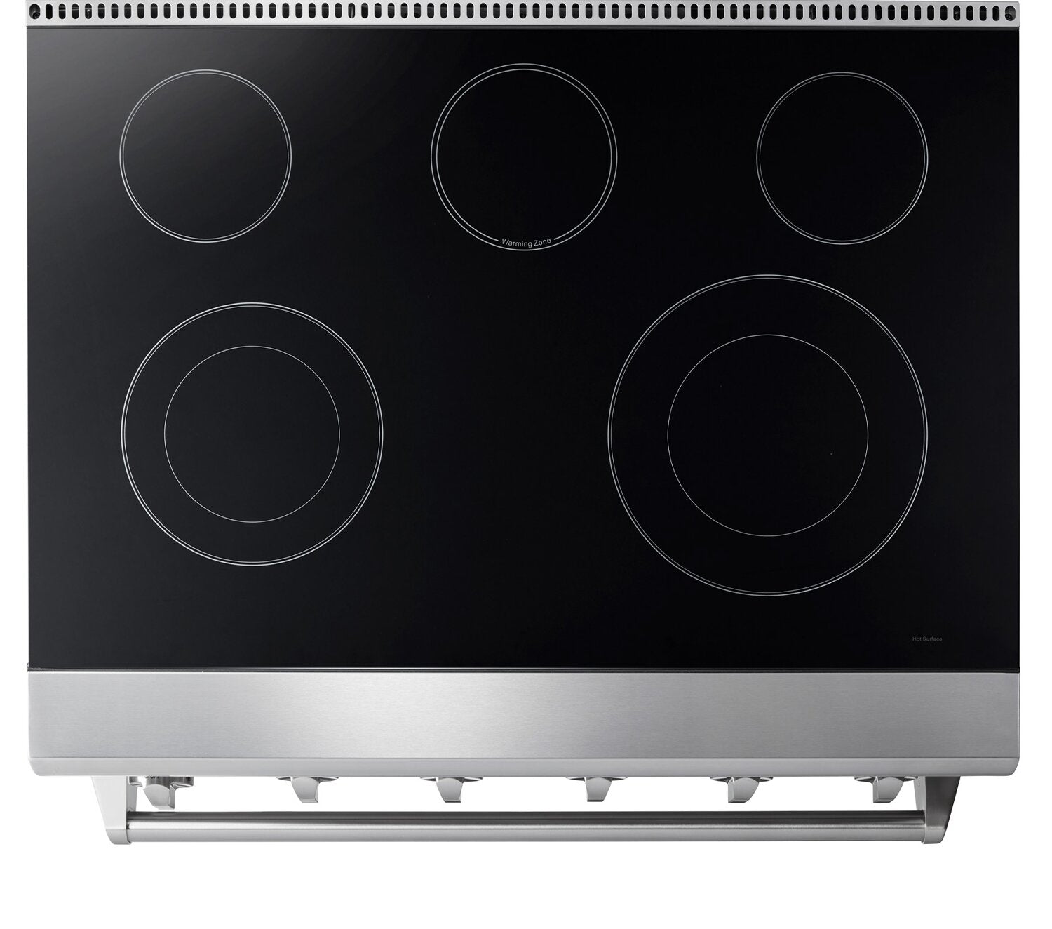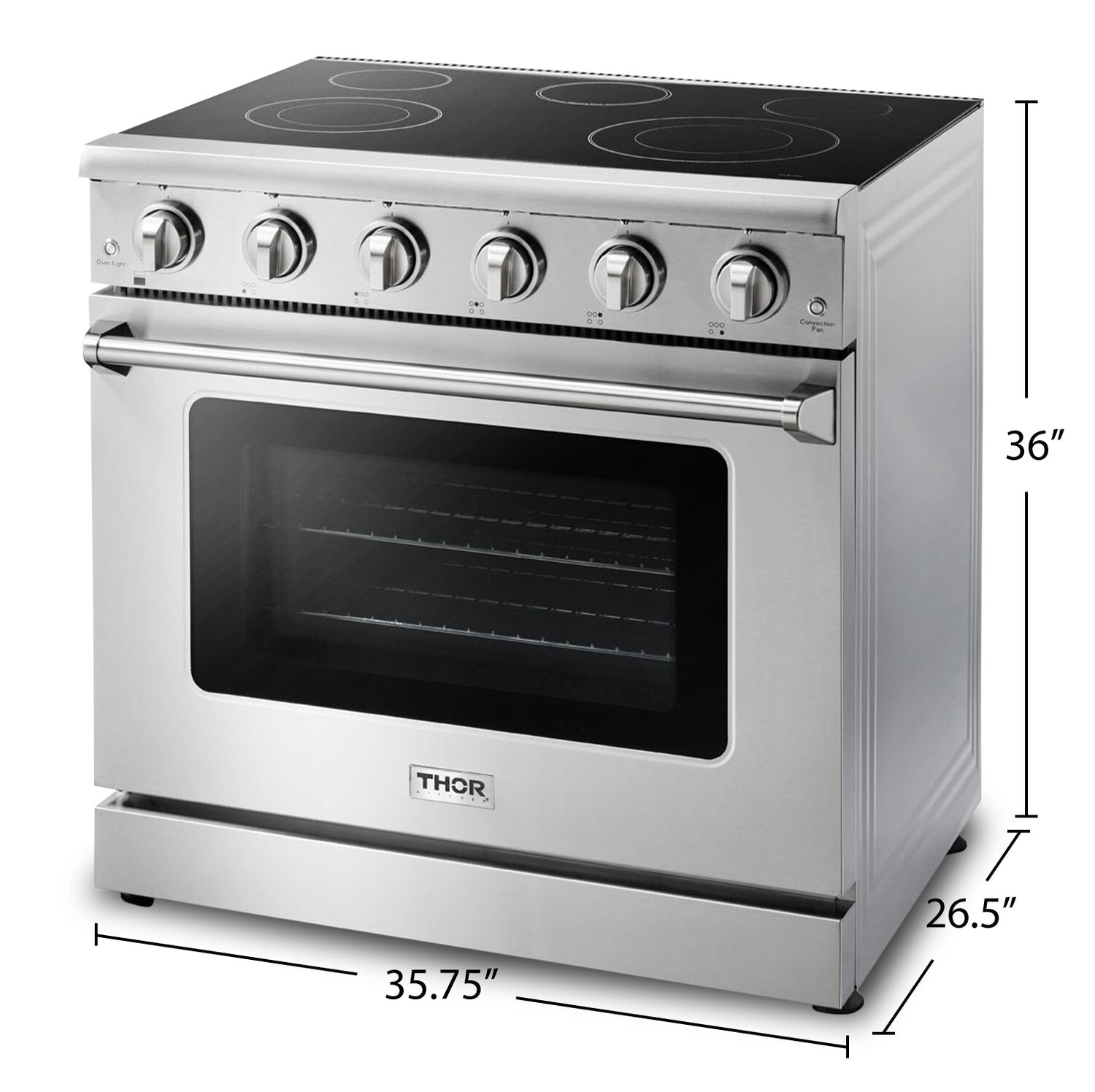 This Thor Kitchen professional-style electric range is designed with powerful features and functionality in mind. Command instant heat with the LightningBoil™ element – this 3,000-watt burner quickly boils water to help get meals on the table in a flash. Or, make use of the warming zone to keep food tasty and prepare delicate sauces. True convection evenly heats your food for thorough results on everything from roast dinners to batches of cookies. Featuring heavy duty metal control knobs and a frameless glass top, this range brings style and durability to your kitchen.