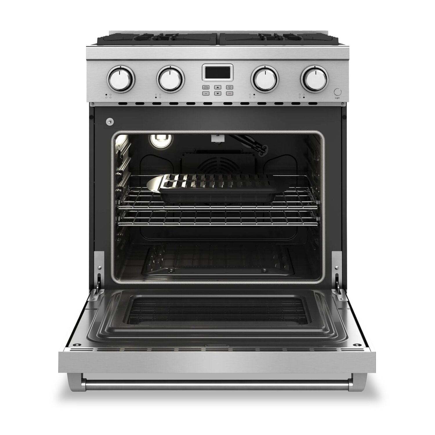 Four Sealed Burners: One-Piece Porcelain Spill Tray: Convection Fan: Continuous Cast-Iron Cooking Grates: |