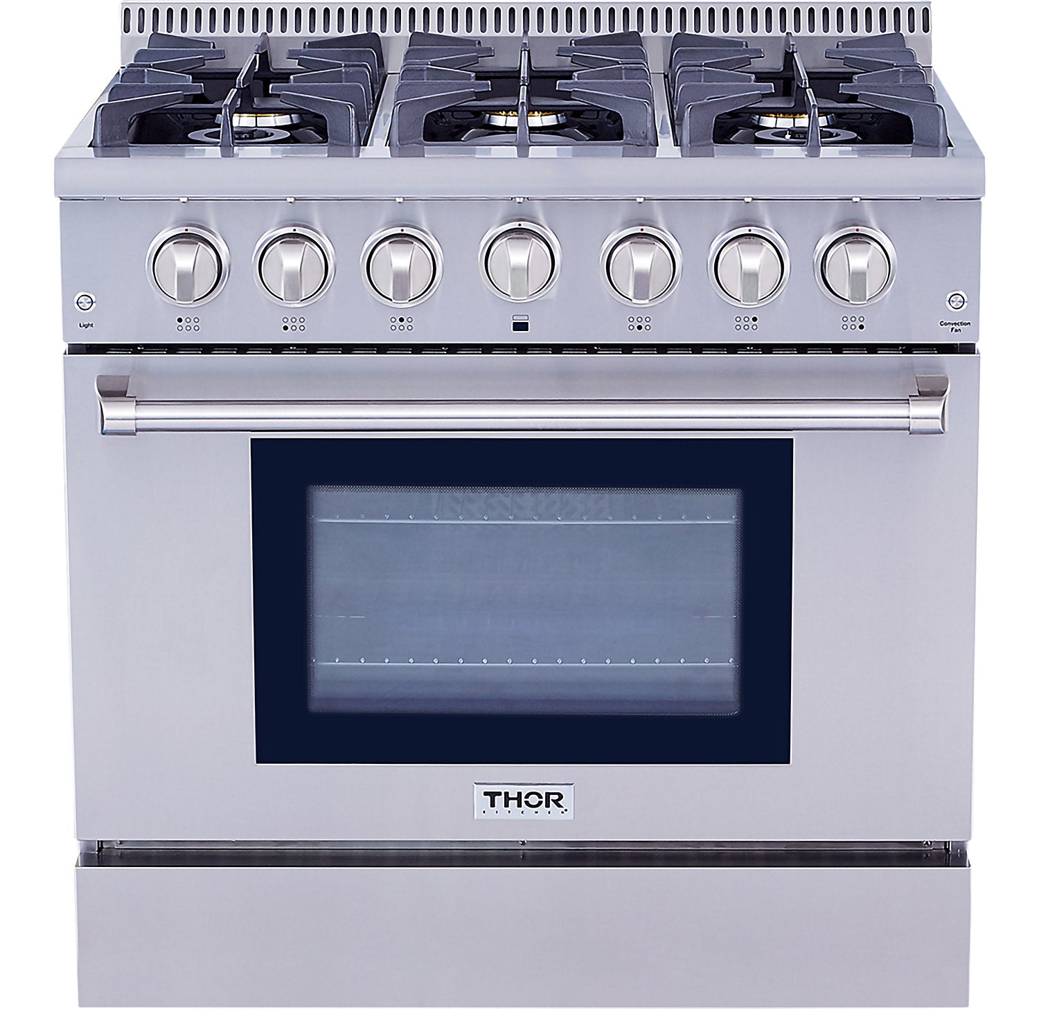 Thor Kitchen introduces this freestanding gas range with features that are equal parts luxury and power. Cooking large meals has never been easier with six sealed burners, two of which are dual burners designed to handle a quick powerful boil or a slow, steady simmer. Continuous cast-iron grates are built to withstand years of heat, while being easy to clean. Inside the oven, enjoy 5.2 cubic feet of commercial-style convection cooking – it saves you time, and ensures juicy sears and crispy crusts. Mechanical knobs make it easy to control your cooktop and oven, while showing a hint of modern flare with blue LED lights.