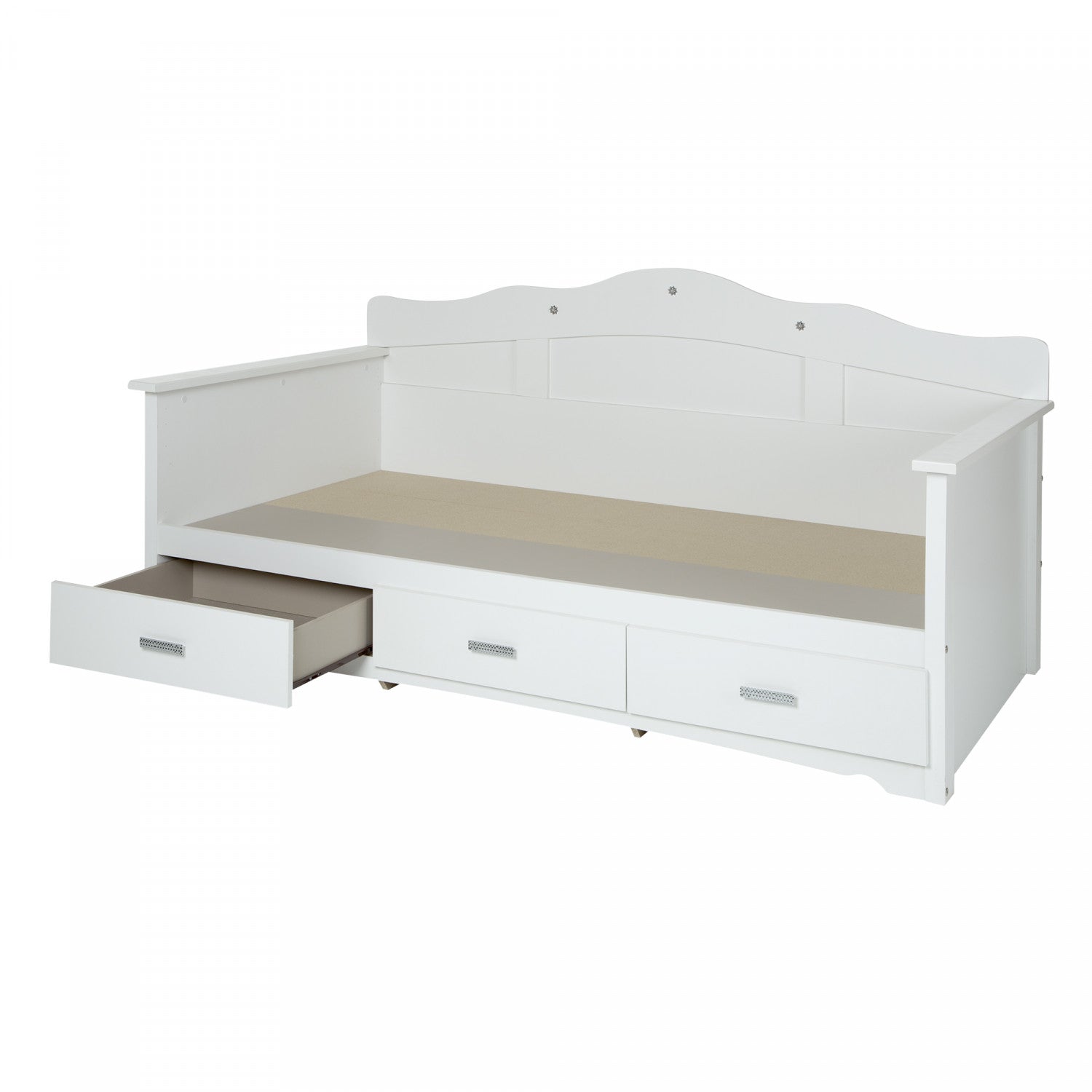 Sweet dreams for your little girl. Make this elegant daybed a part of your daughter’s ideal bedroom. The design elements are the stuff of dreams: jewel-like ornaments on the back and a trio of fabulous drawer handles. The wave-like shape, similar to a tiara, is sure to add a royal touch to your home! Finish off the look with bedding and pillows in a princess, fairytale, or unicorn theme, to create a decor that’ll fuel your little girl’s imagination. A 2-in-1 bed base. this dual-function daybed is the ideal piece for a small room or something you can convert for a sleepover. All you need to do is switch the throw pillows for a nice, comfy sleeping pillow and arrange the bedding to create a cozy little nest. When you turn it back into a sofa, the raised sides – headboard and footboard on a bed – can be used as armrests. The configuration is truly ideal for a quick switch from a sitting space to a bed. Well-organized storage everyone knows that a princess’s bedroom can never be messy! This piece features a royal design that’ll make your damsel oh-so-happy, and the three drawers in the bed base will be great when tidying up the room… as if by magic! You can organize toys, clothes, costumes, or bedcovers in separate drawers. They’re set low and mounted on metal slides that move back and forth easily, so your little girl can also access them, which should help her develop good habits!